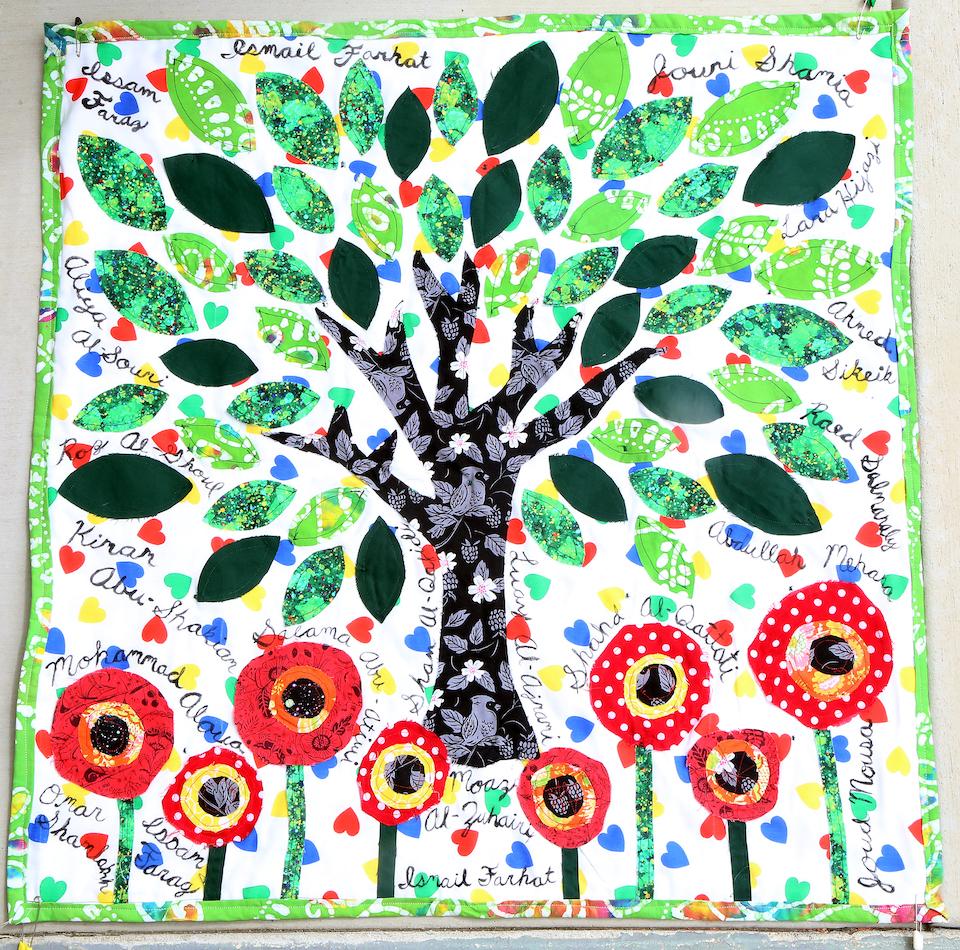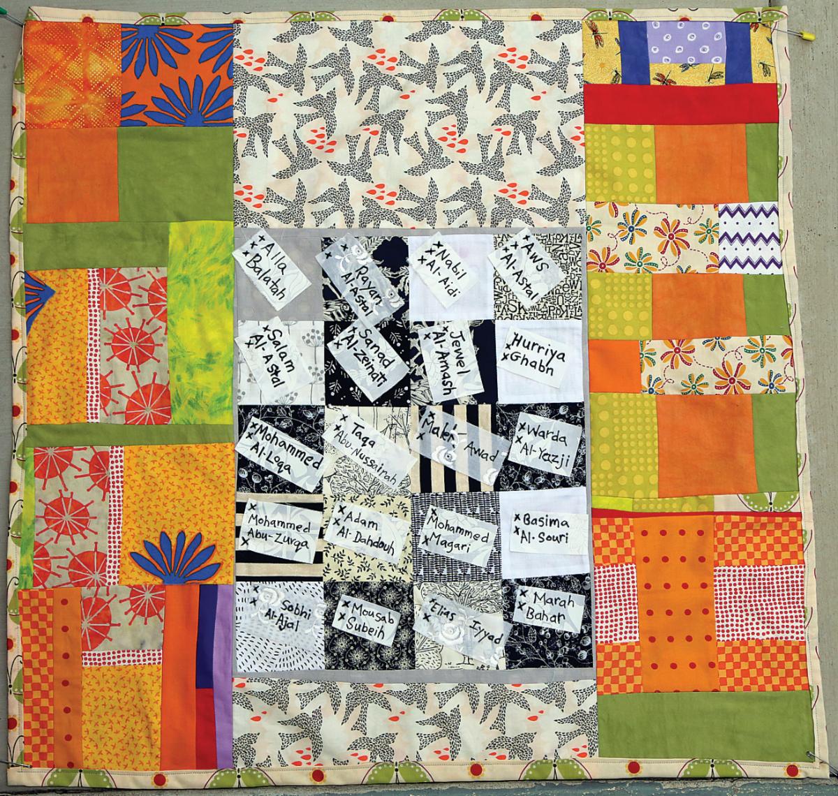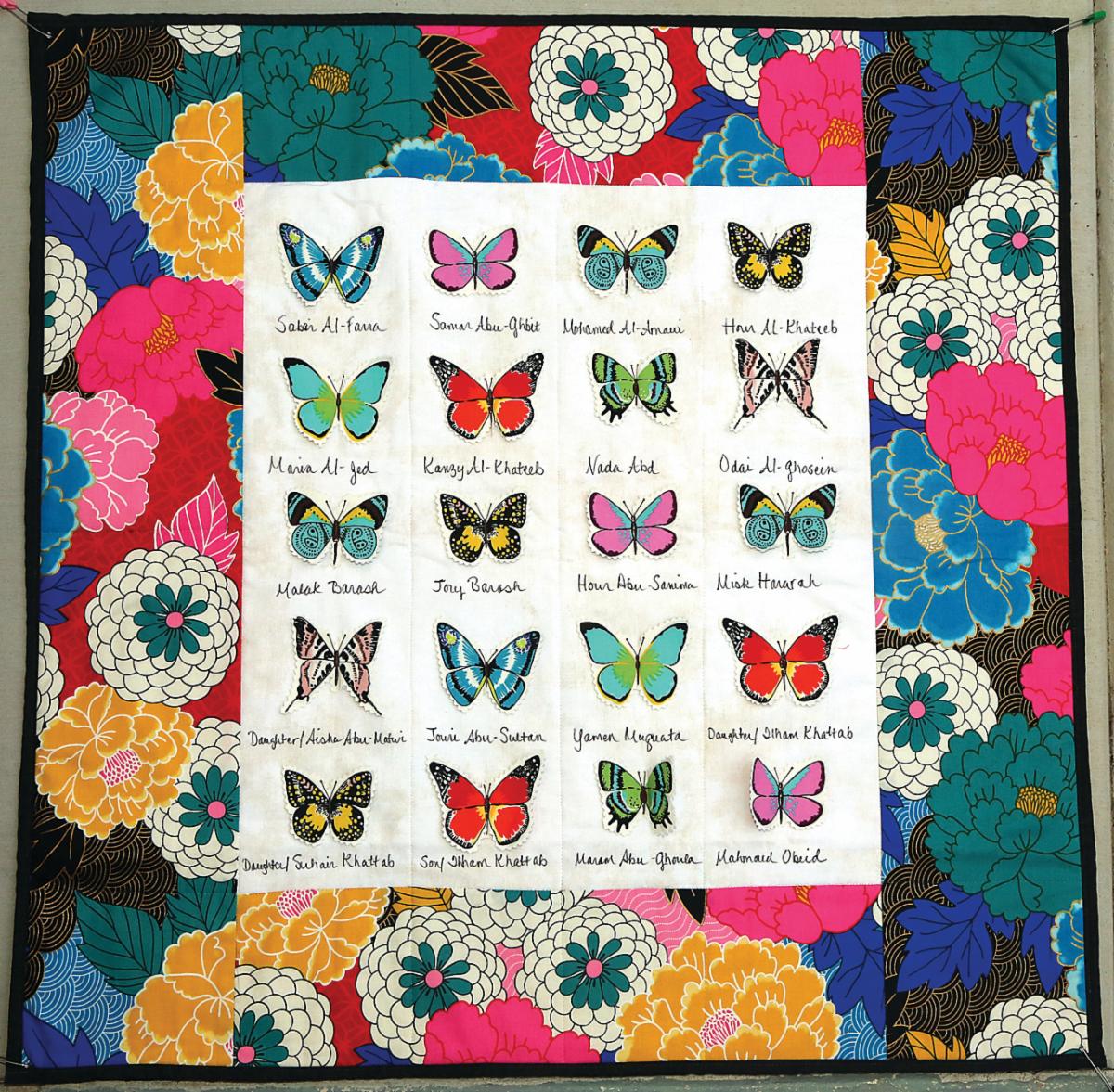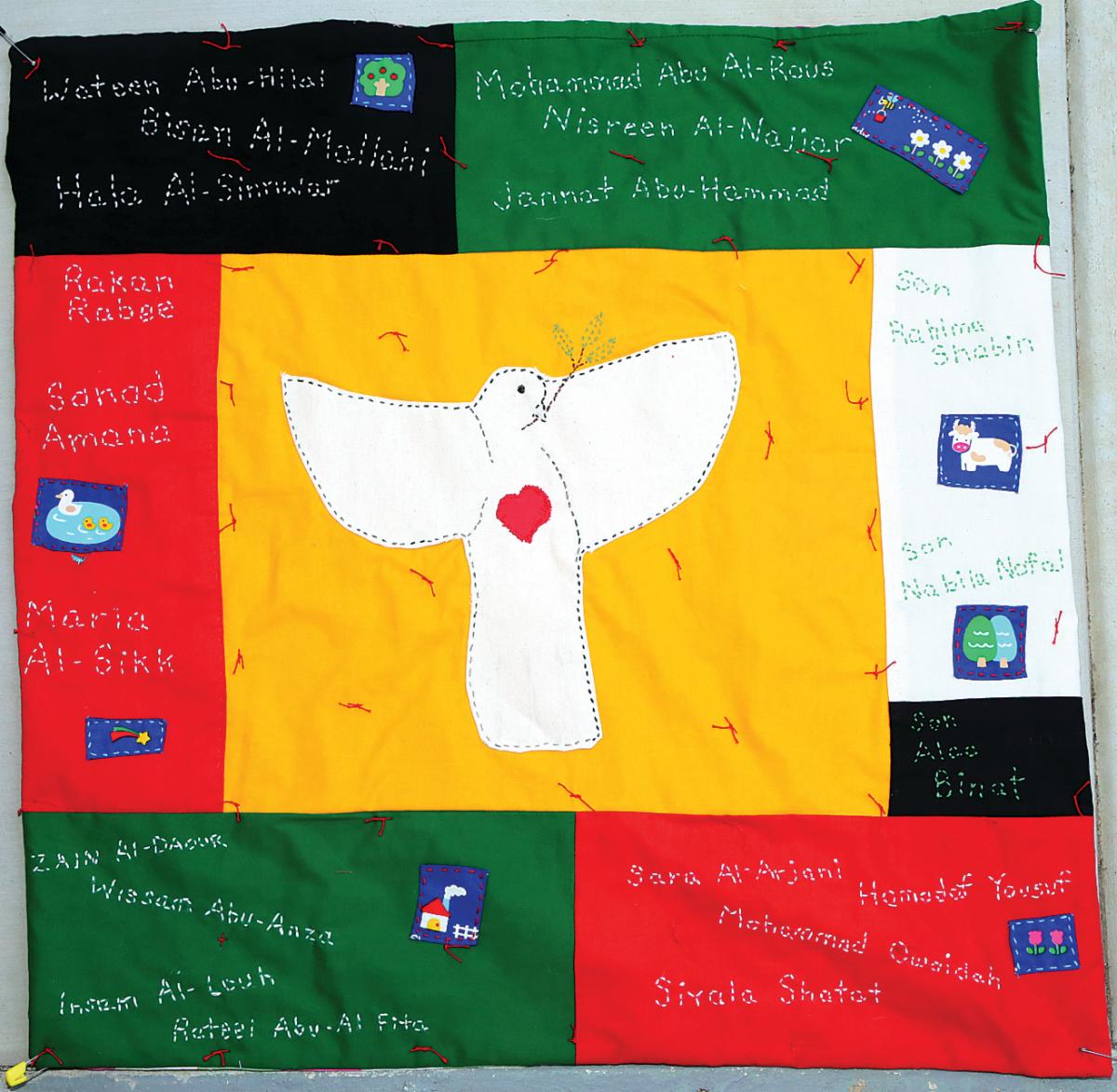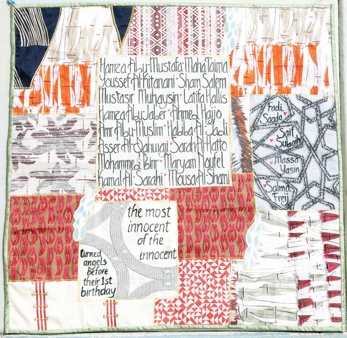 Janet Swann “My quilt portrays what a Palestinian baby’s life would have been filled with: love, home, safety, tatreez stitchery from a grandmother, handmade toys from a grandfather, a beautiful colorful world – and the heritage of the Palestinian people, represented by the national flower.“