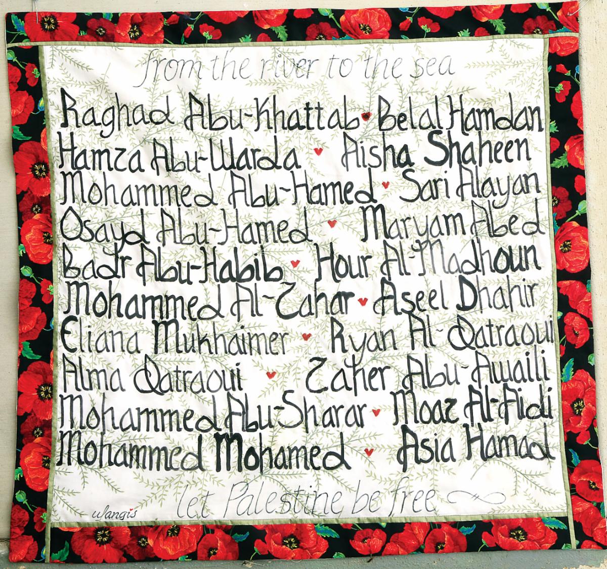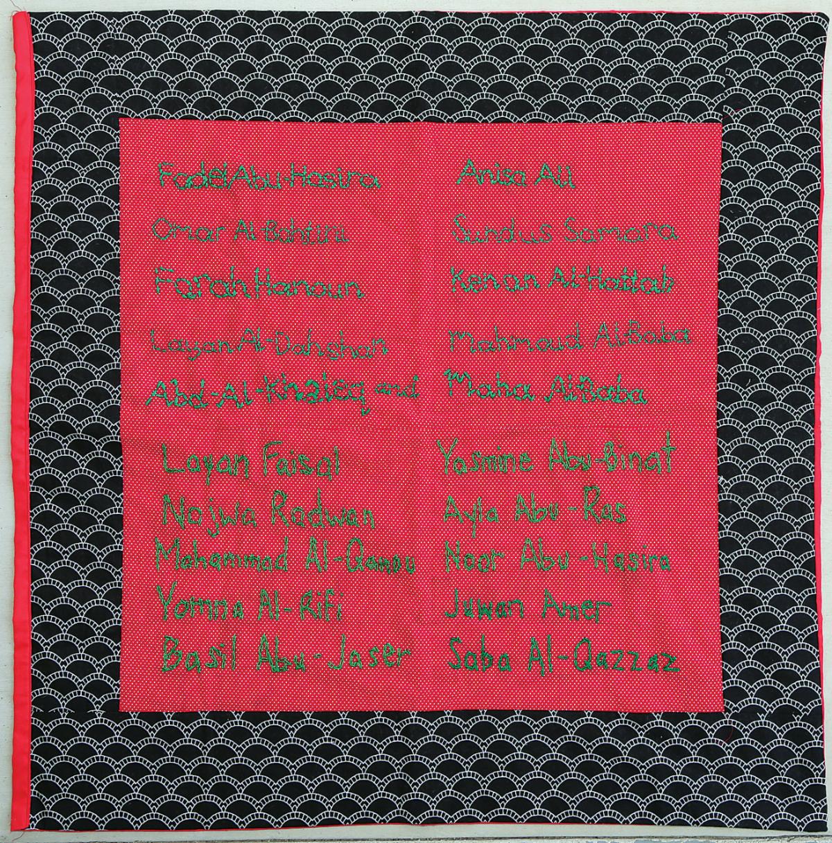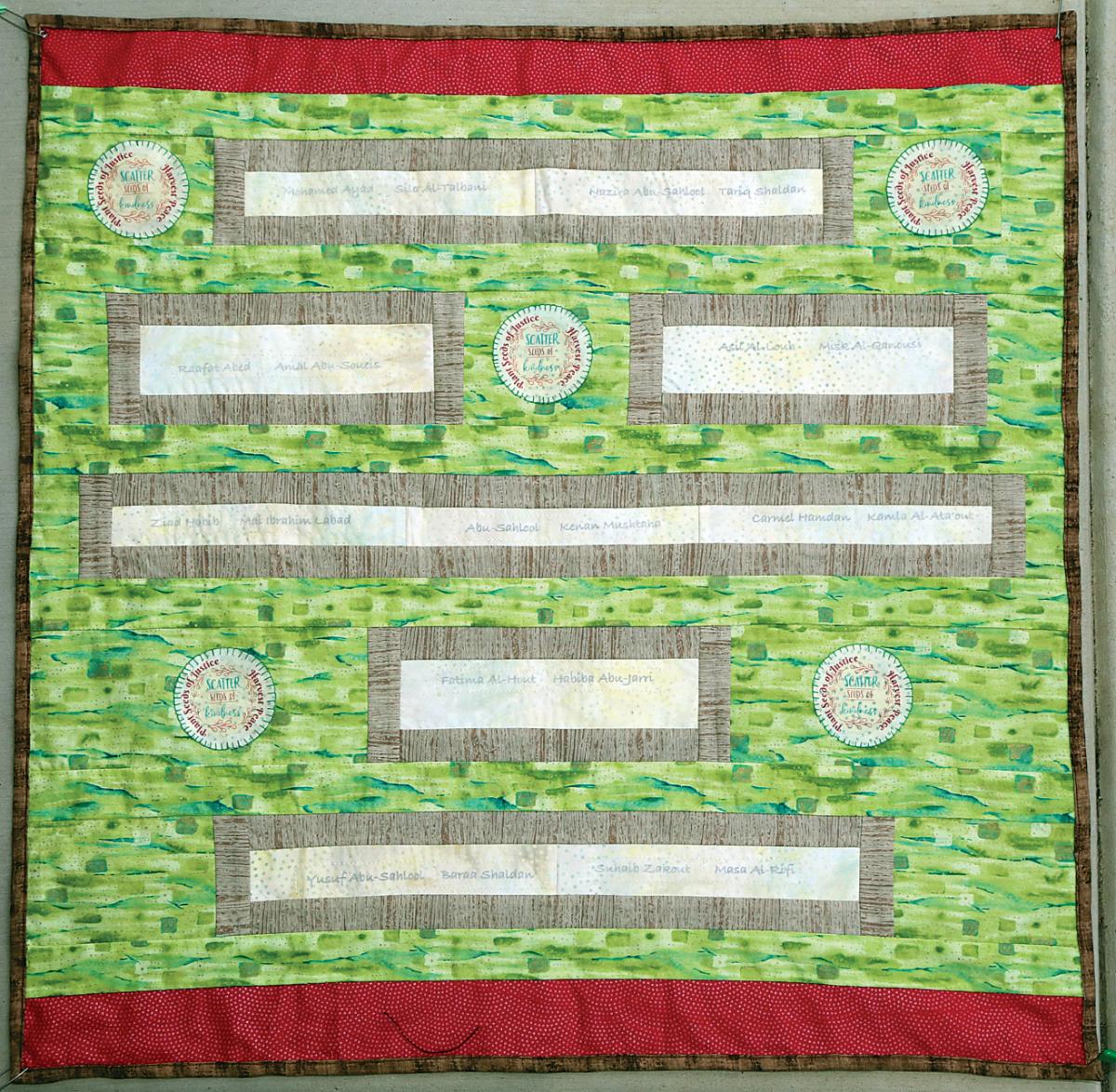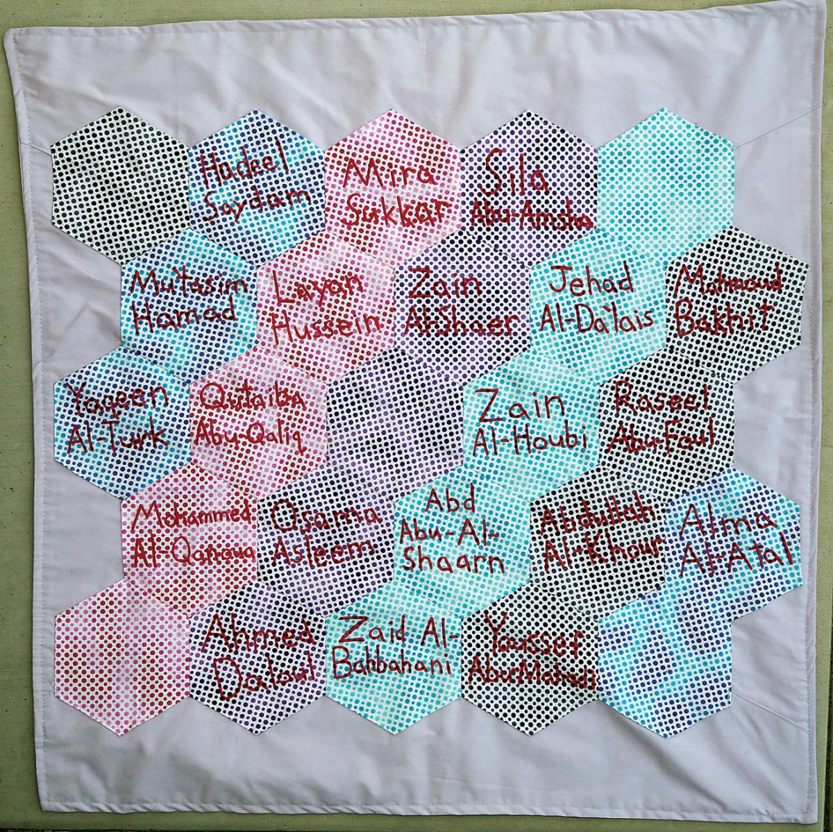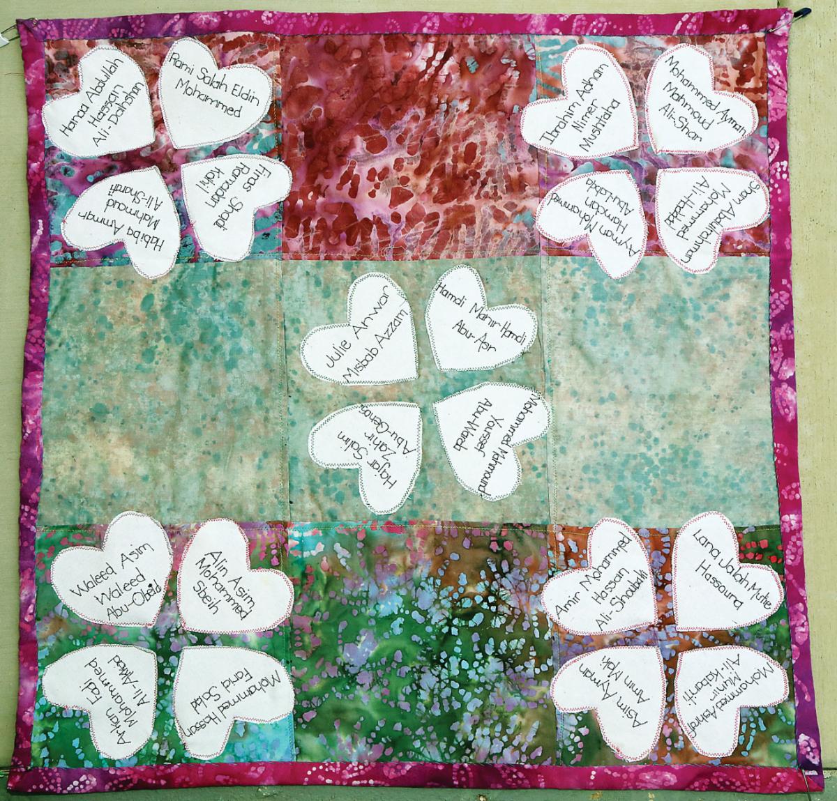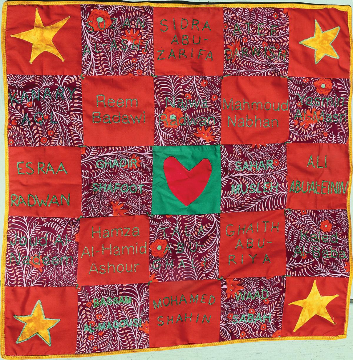 Janet Swann “My quilt portrays what a Palestinian baby’s life would have been filled with: love, home, safety, tatreez stitchery from a grandmother, handmade toys from a grandfather, a beautiful colorful world – and the heritage of the Palestinian people, represented by the national flower.“