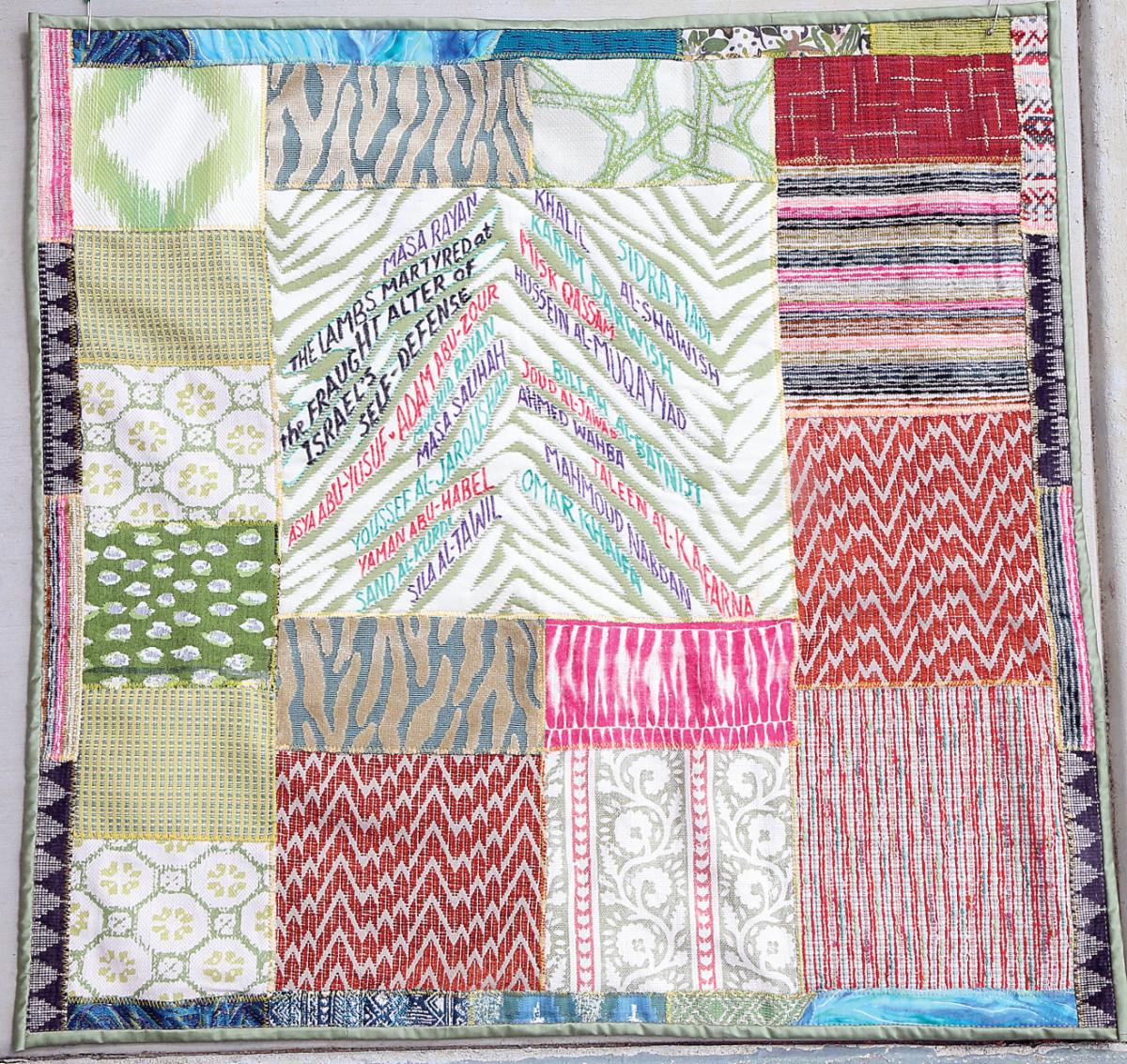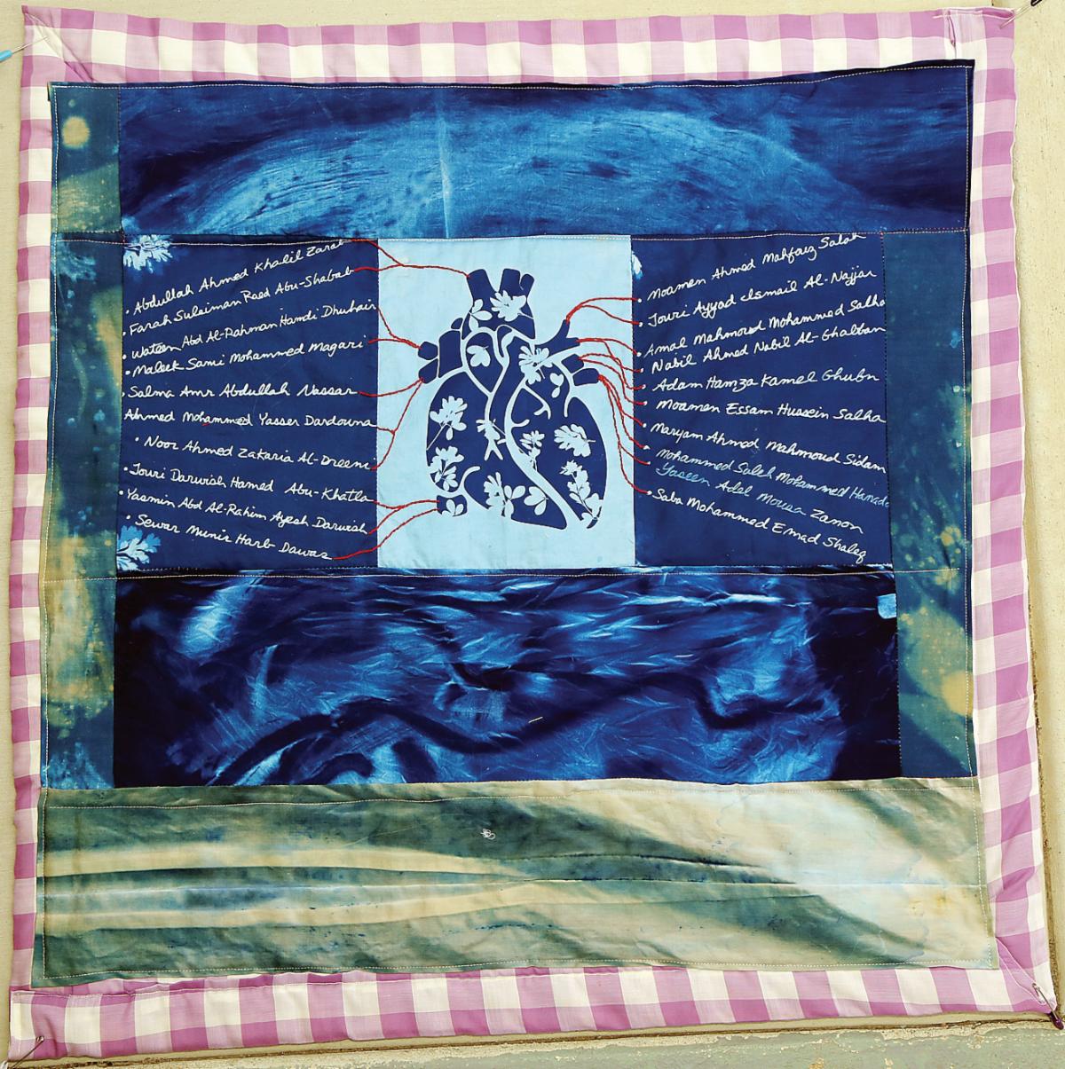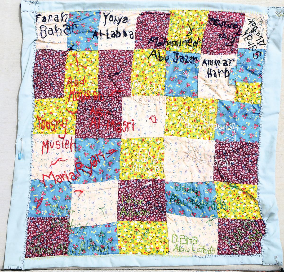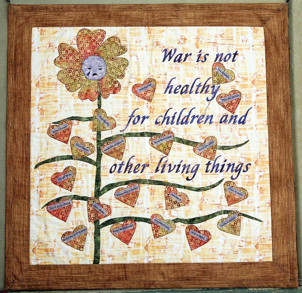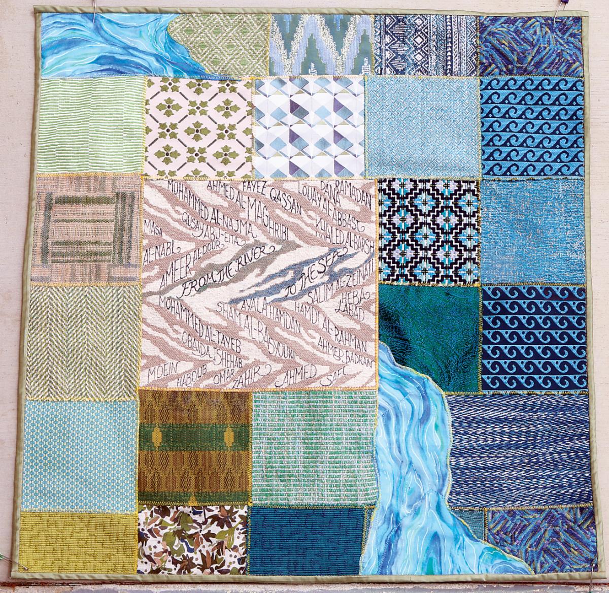 Janet Swann “My quilt portrays what a Palestinian baby’s life would have been filled with: love, home, safety, tatreez stitchery from a grandmother, handmade toys from a grandfather, a beautiful colorful world – and the heritage of the Palestinian people, represented by the national flower.“