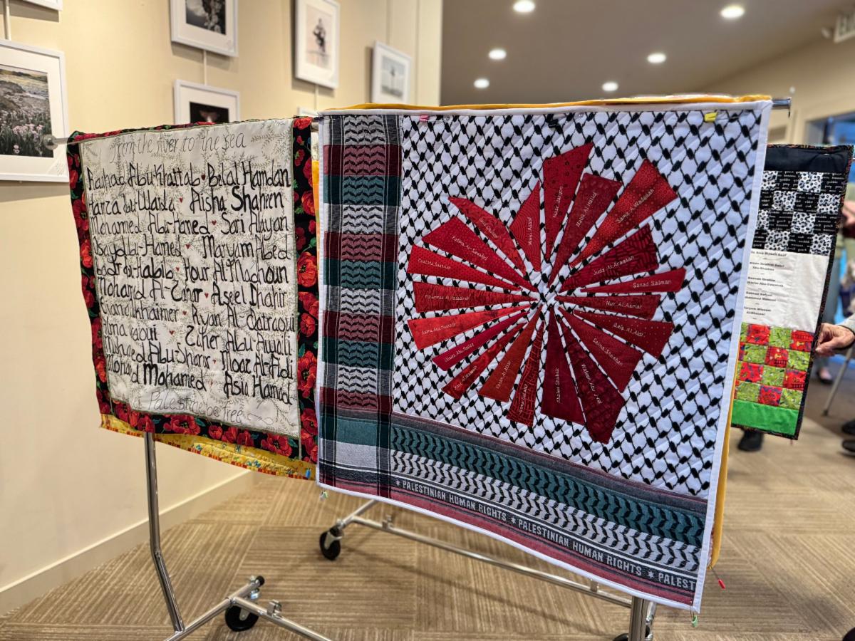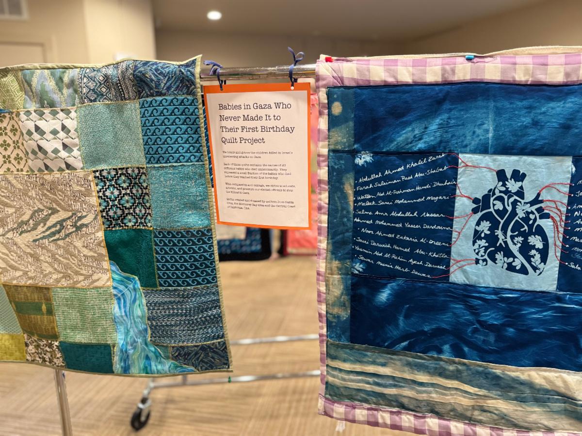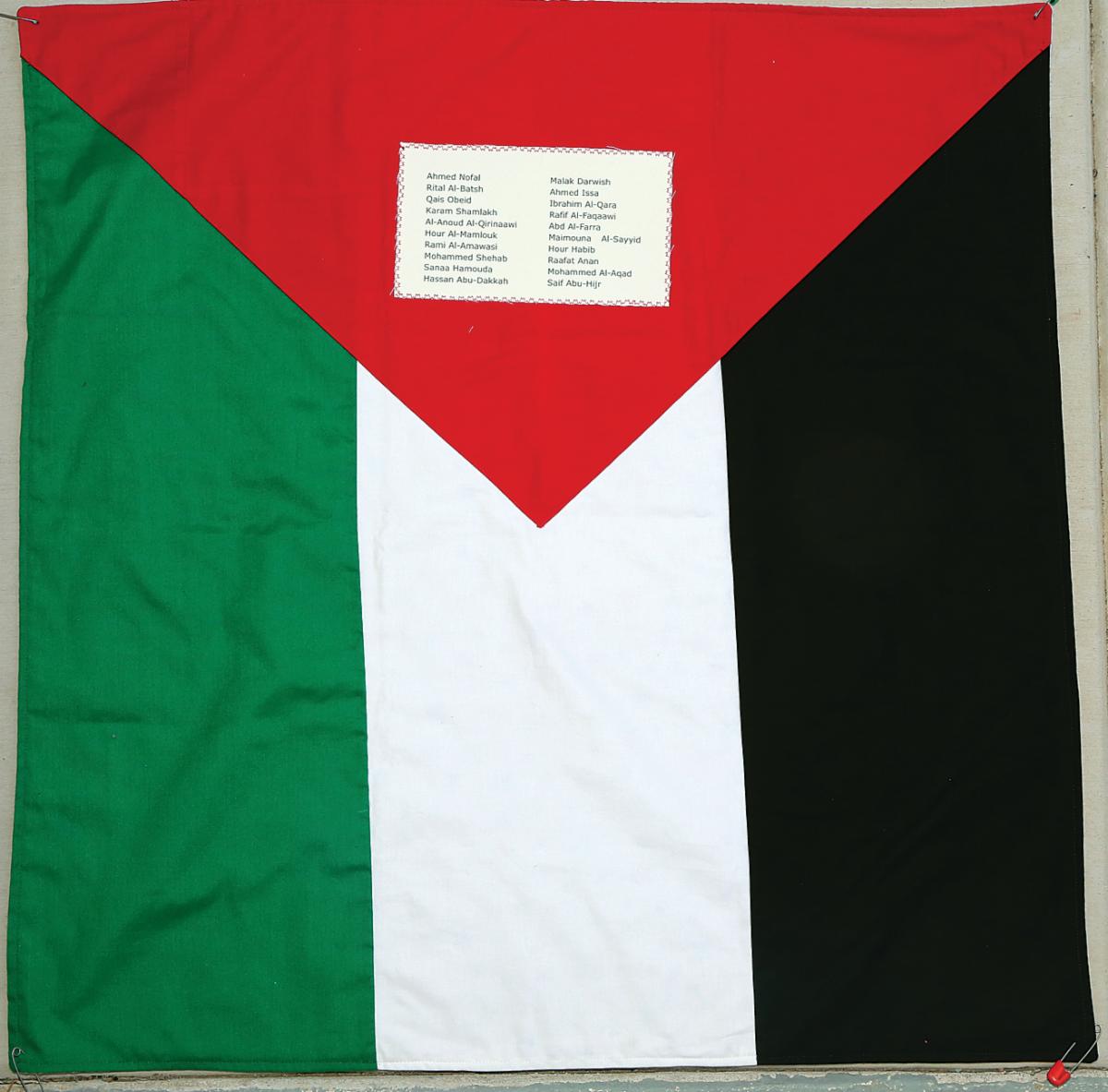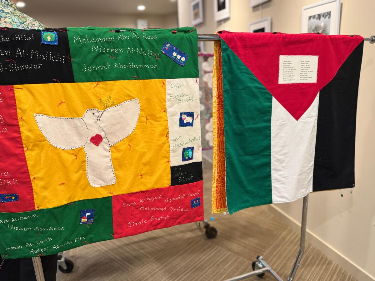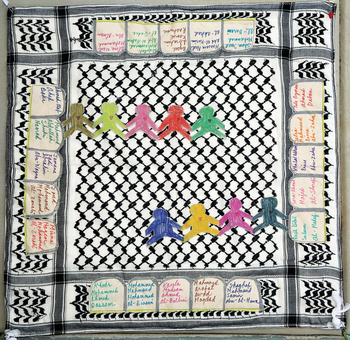Janet Swann “My quilt portrays what a Palestinian baby’s life would have been filled with: love, home, safety, tatreez stitchery from a grandmother, handmade toys from a grandfather, a beautiful colorful world – and the heritage of the Palestinian people, represented by the national flower.“
