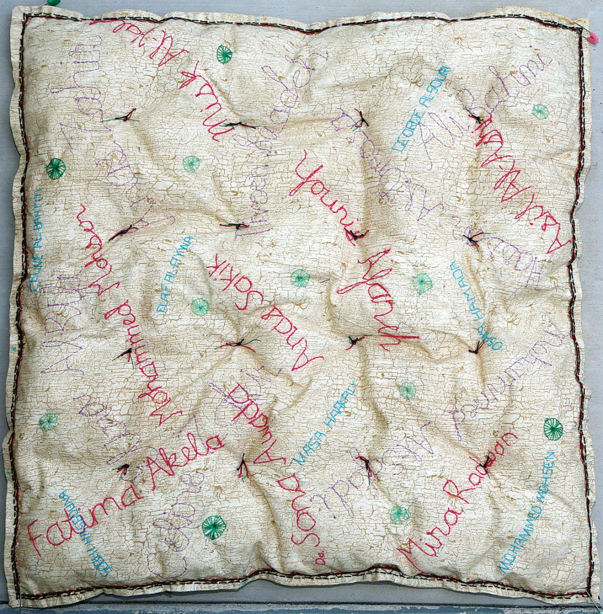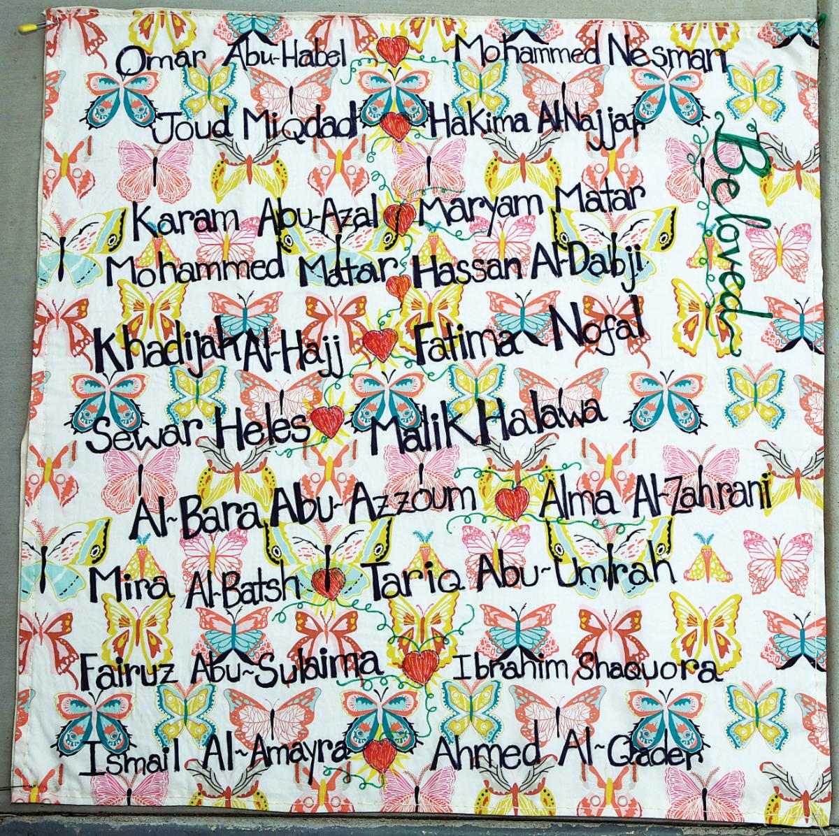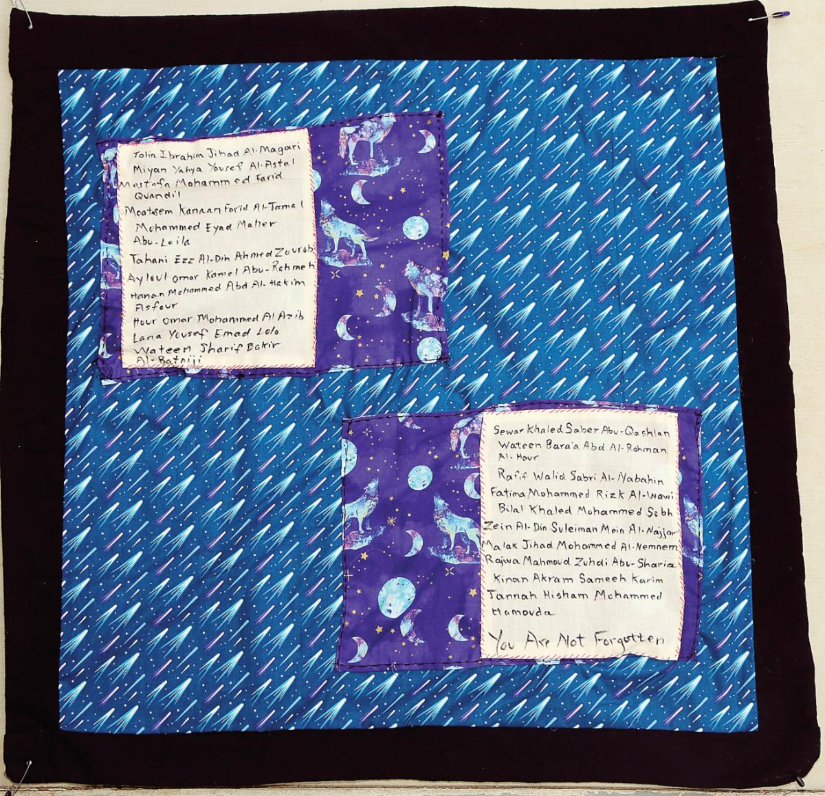 Nancy Goudari, "My original idea morphed from an art piece/memorial to traditional baby quilt so each block with each child’s name could at least represent the baby quilt she or he should have had."