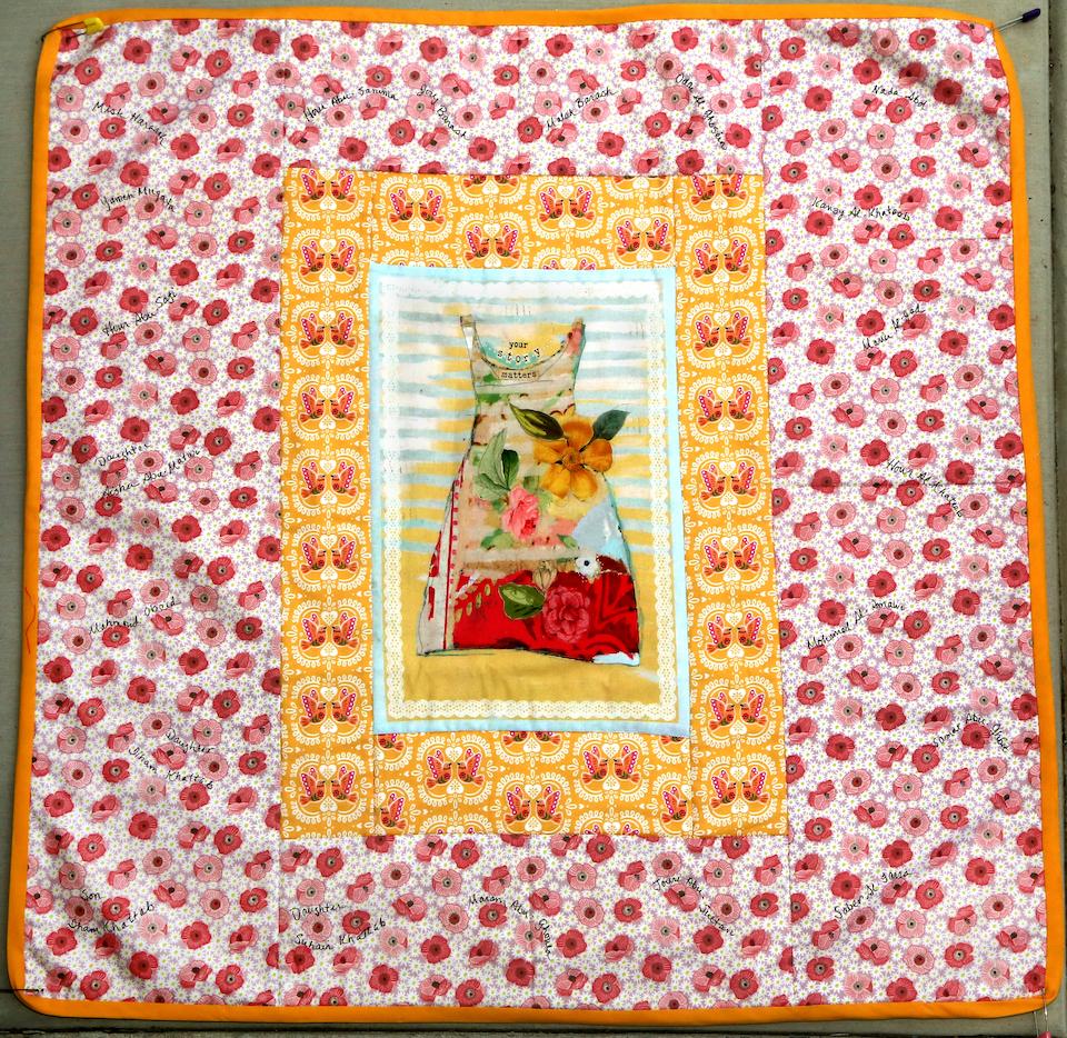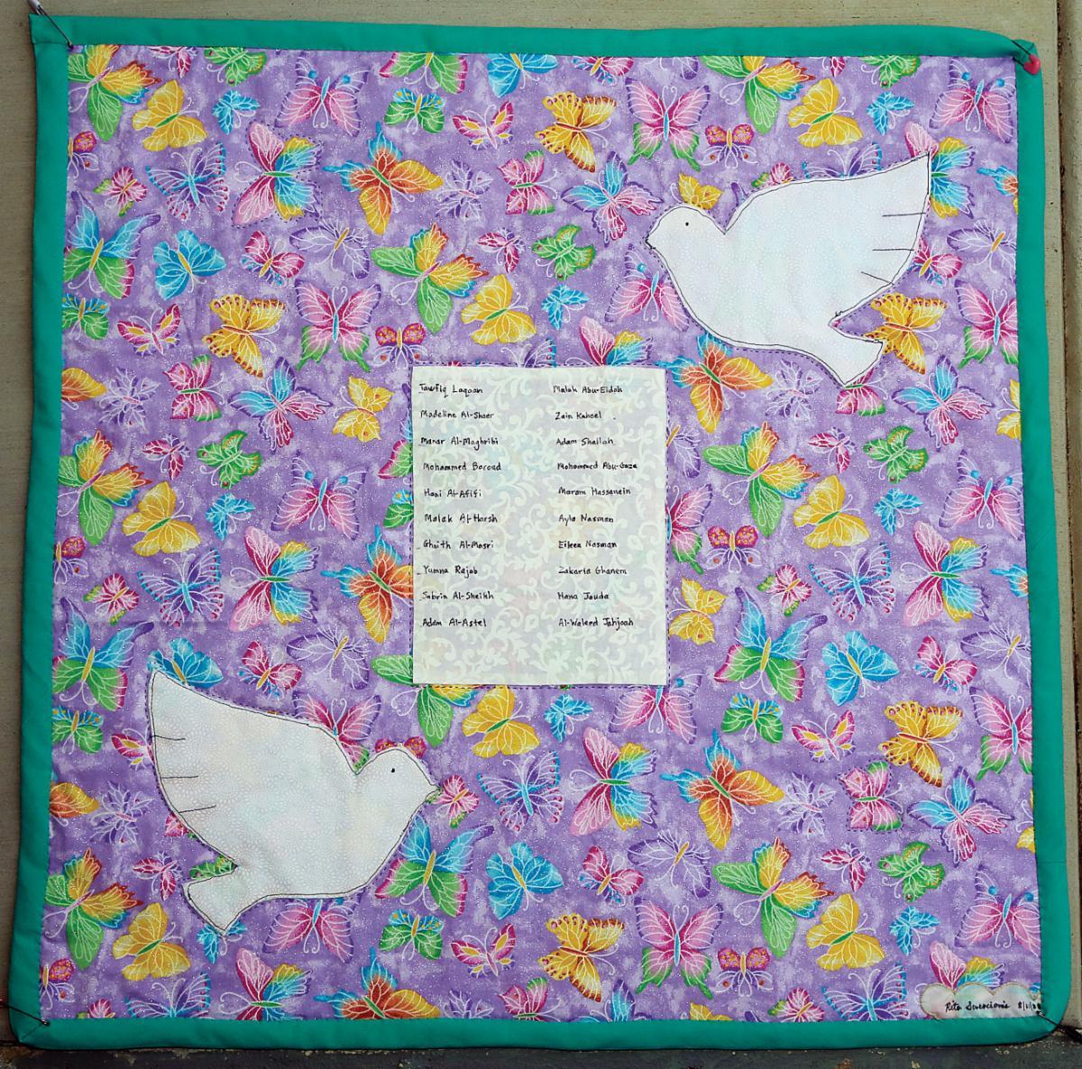 Angela Gleason “About my quilt. It is the first one I have made. My mother was a quilter. The foundation of this piece is a part of her first quilt. I used cyanotype (solar printing) to put their names on the fabric. I felt joining it to my mother's piece was a reminder how grateful I am to have lived and enjoyed my mother's long life. She lost one child and I know how devastating that was. I can't imagine the pain that all the mothers of these children are experiencing.”