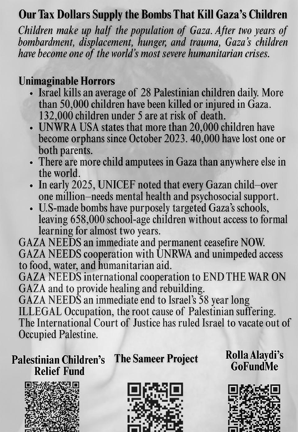 “The subdued tans and browns used are the colors of the immense amount of rubble entombing the babies and which Gaza has been reduced to by the ceaseless bombing of their cities and towns, the destruction of their olive groves and pasture lands.