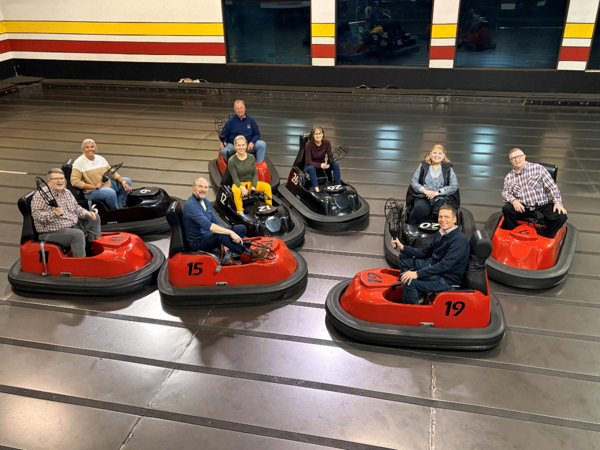 | | English District Staff Excursion | | | The English District’s staff, and a few spouses, recently met to play a few friendly rounds of WhirlyBall. You may be asking, “What is WhirlyBall?” It is best described as a team sport that combines elements of basketball, lacrosse, hockey, and jai alai. WhirlyBall is played while riding in a bumper car (called a Whirlybug). In one hand, the player has a jai alai-style plastic scoop, and in the other hand, a steering crank. The ball being tossed around is a softball-sized Whiffle ball. At each end of the court, there are vertically hung backboards with a hole in the center. Behind the hole is a swing gate equipped with a buzzer to notify the referee when a score is made. Five rounds of WhirlyBall were played, with the men competing against the women. The women won, with the final score being 3-2. There was much laughter throughout, and smiles were on everyone’s faces. After playing WhirlyBall, the group went for lunch and enjoyed more fellowship time together. | | |