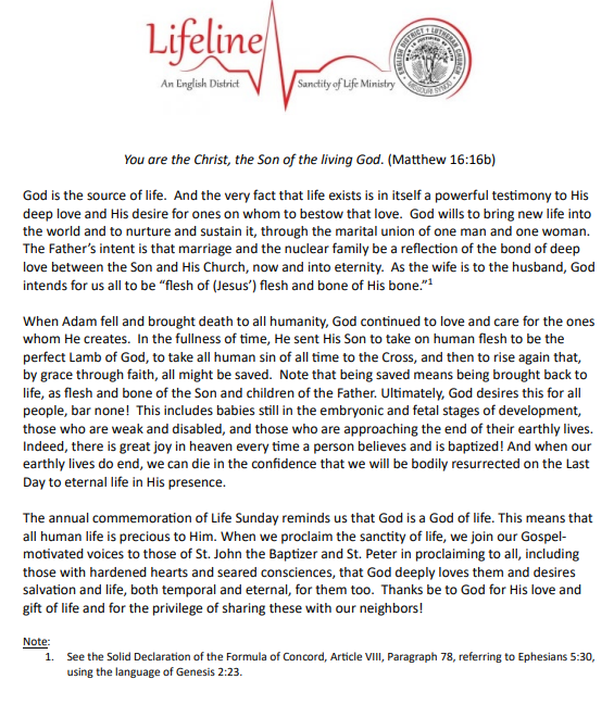 For congregations, we highly commend the Lutherans For Life free resources available for Life Sunday 2026 (January 18) and Life Week 2026 (January 18-24).