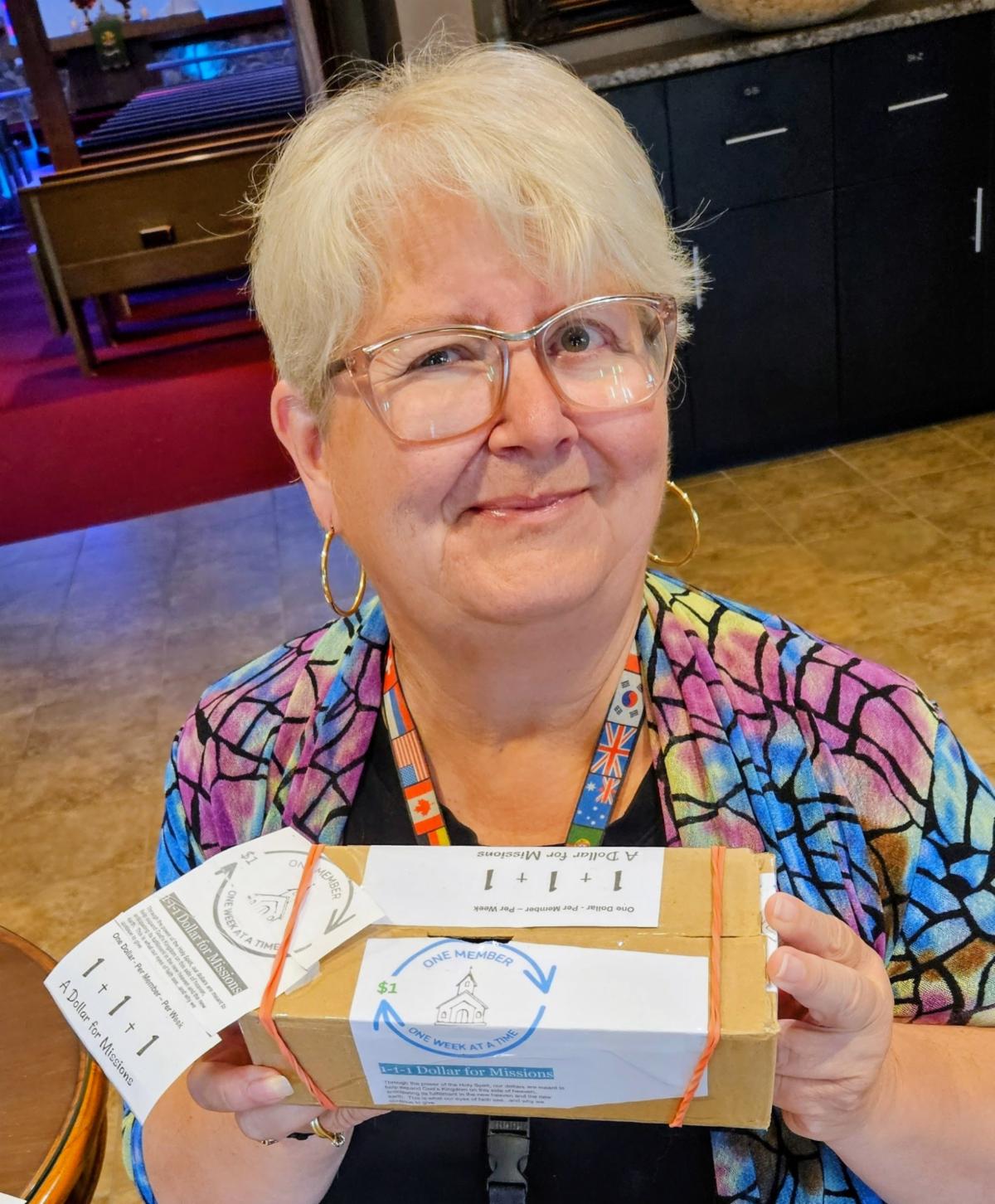 Pictured: Lynda Buch, a member of church leadership at Hope Lutheran Church, Kitchener, ON, with the congregation's 1-1-1 box.