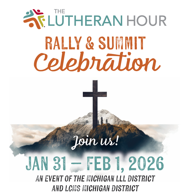 Join us January 31, 2026, and February 1, 2026, for The Lutheran Hour Rally & Summit Celebration coordinated by the Michigan District. This event will focus on re-inspiring laity to invest in their God-given talents and to reach beyond church walls to spread the gospel message of our Risen Savior. The Rally & Summit is designed for all congregations to participate, either in-person or online.