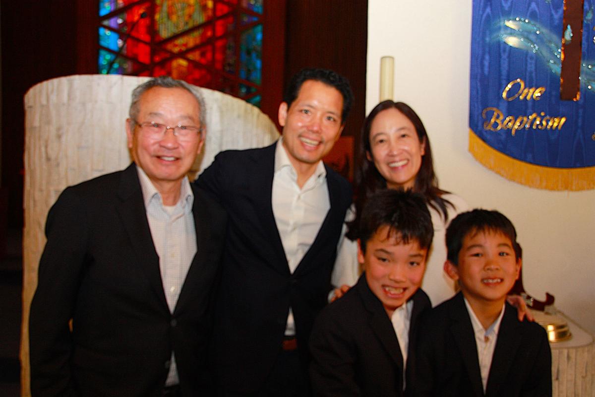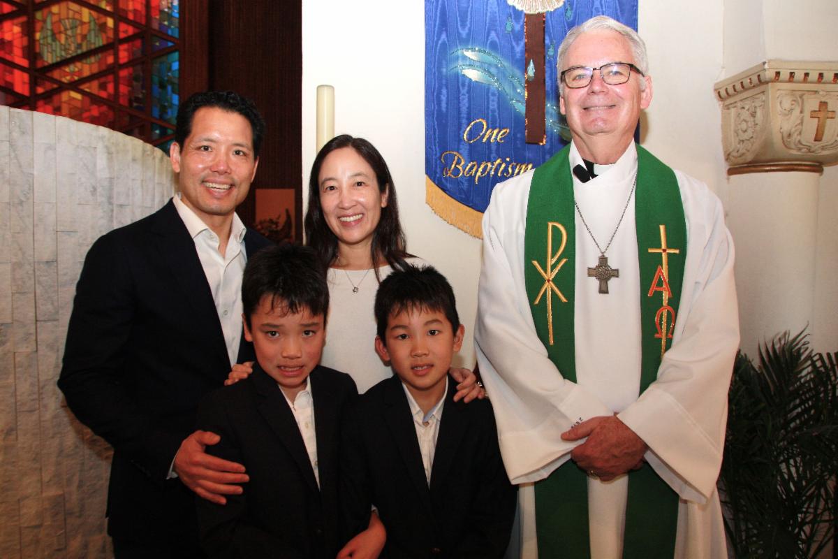 Pastor Curtis Binz, members of West Portal Lutheran Church, and their parents and grandfather welcomed Tobin & Gavin through the waters of baptism.