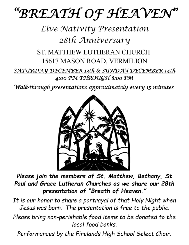 Members of St. Matthew Lutheran Church, Bethany Lutheran Church, and Grace Lutheran Church are hosting a live Nativity presentation. The “Breath of Heaven” live Nativity will take place at St. Matthew Lutheran Church, 15617 Mason Road, Vermilion, OH 44089. Call Kathy at 440-225-9775 if you have any questions.
