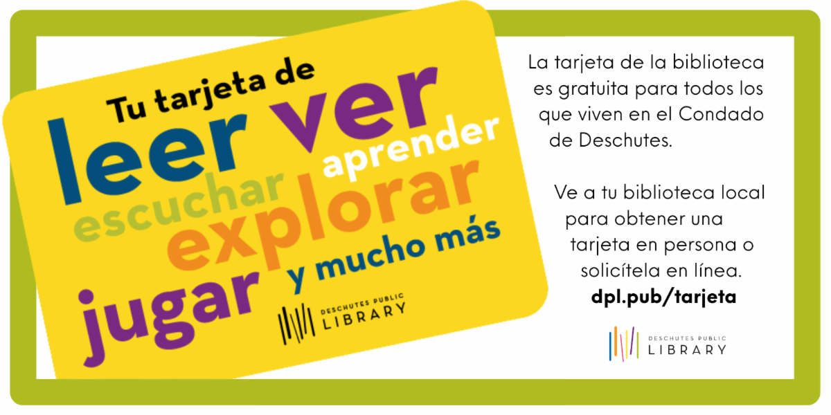 Aproveche de los recursos gratuitos que la biblioteca provee. Nuestra colección incluye materiales para lectores de todas las edades e intereses. Tome prestados libros, DVDs, juegos de mesa, artículos de la “Biblioteca de Cosas” y mucho más. Además, la colección digital les dará acceso a miles de libros electrónicos y audiolibros. Trasmita películas, series de televisión o baje sus periódicos y revistas favoritas. Acceda nuestro catálogo entero 24 horas al día desde su computadora o dispositivo móvil. Todos los que viven en el Condado de Deschutes pueden obtener una tarjeta gratuita de la biblioteca. Consiga una tarjeta hoy.