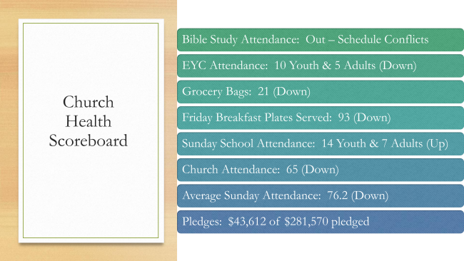 If you added someone to the "Prayers of the People" during our worship service please follow up with a phone call to the office and we will add them to next Sunday's prayer list. Also, let us know how the person you requested prayer for is doing.