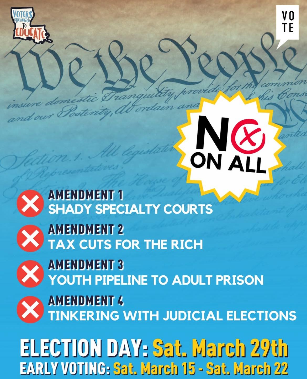 The regular legislative session begins April 14, 2025. But first: we have an election on March 29 where everyone in the state will vote on four proposed constitutional amendments. Vote no on all four. More below.