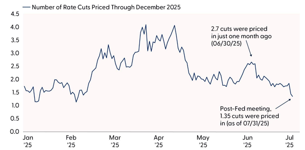 Data series measures the number of 0.25% rate cuts implied by federal funds futures market pricing. Source: LPL Research, Bloomberg, 07/31/25 Disclosures: All indexes are unmanaged and cannot be invested in directly. Past performance is no guarantee of future results. Estimates may not materialize as predicted.