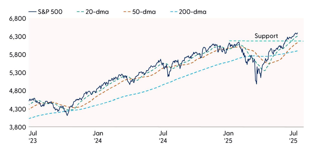 Volatility came back on cue last week as the S&P 500 fell close to 2% on Friday, ending a 32-trading-day streak without a 1% decline. Selling pressure was widespread and dragged the index back below its 20-day moving average (dma), an area that has been a consistent area of dynamic support over the last few months. This leaves the 6,200 area as the next area of support for the broader market, followed by February highs at 6,144. Breadth measures are holding up relatively well, with over 50% of S&P 500 stocks holding up above their 200-dma on Friday, while the majority of index constituents remain in uptrends.