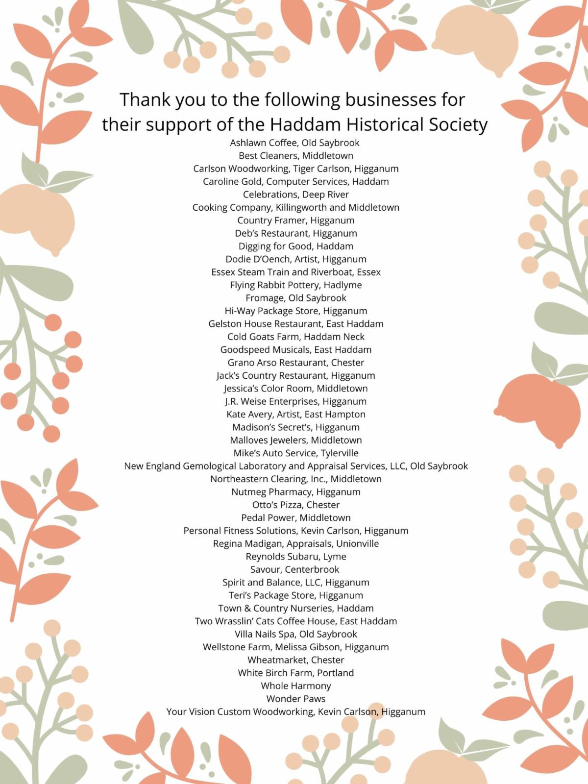 Thank you for your previous contributions to the Haddam Historical Society. Your support has helped us weather the past two difficult years of Covid-19 and related shut-downs and cancellations. The Society has continued its mission to collect, preserve, interpret and promote the history and heritage of Haddam with collections care, online programs and traveling exhibits. We have carefully opened the museum back up and held a number of outside events including a summer concert series, walking tours, knitting bee and Founders’ Day Celebration. Although school programs were cancelled, we did present a $500 scholarship to a graduating HK senior in May.