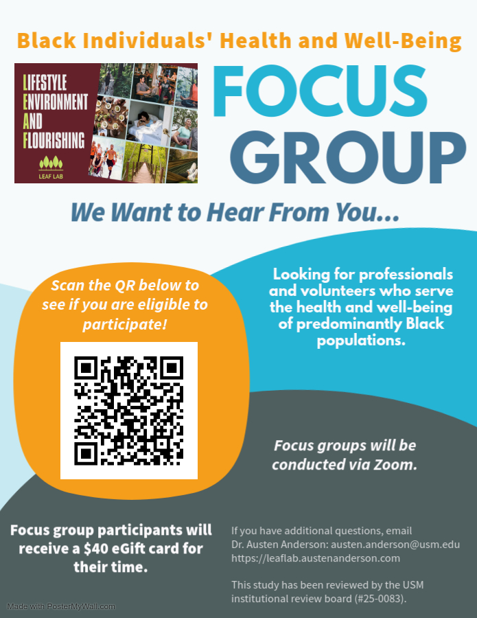 We invite you to participate in a virtual focus group exploring Black individuals' health and well-being as part of a study by the LEAF Lab (Lifestyle, Environment, and Flourishing).