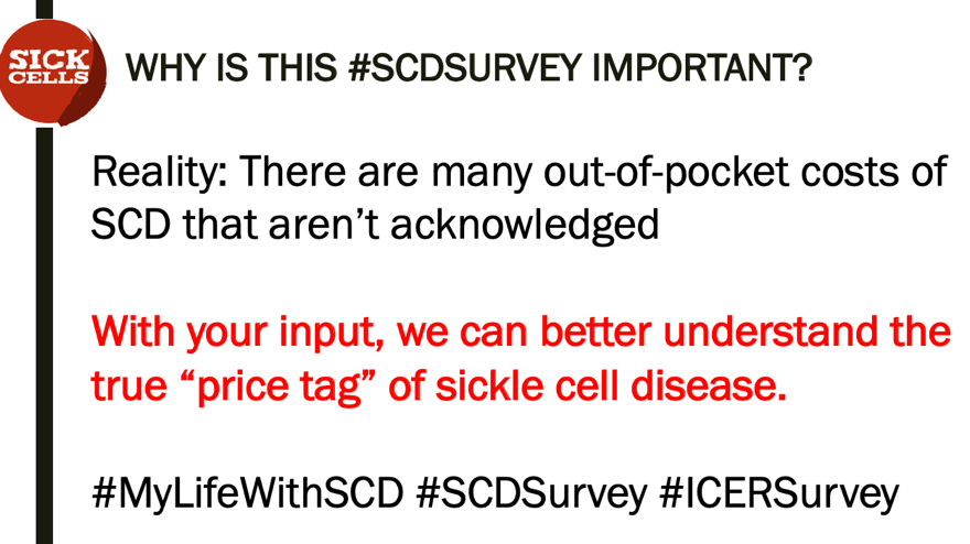 The survey takes about 15-20 minutes and has been developed by Sick Cells in collaboration with ICER. What's ICER? A private organization that helps influence drug pricing and access. The voices in our sickle cell community need to be louder than ICER's! Your responses are anonymous and will help shed more light on living with SCD day to day, what it’s like to be a caregiver, and how much SCD is costing you out-of-pocket.