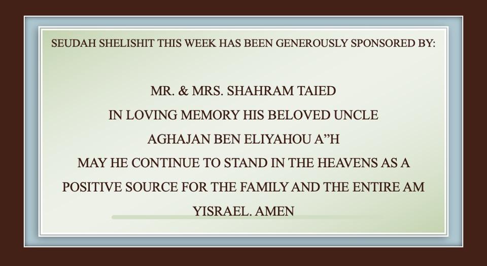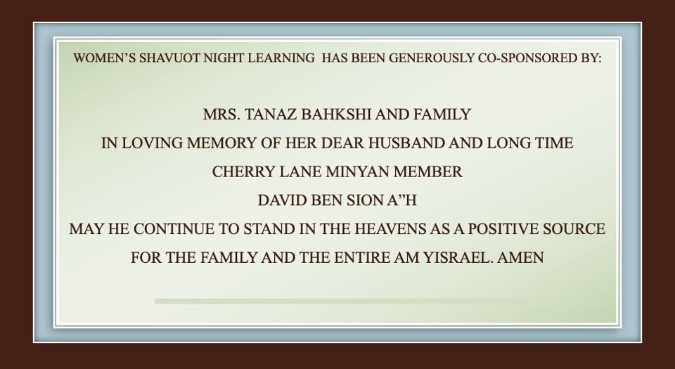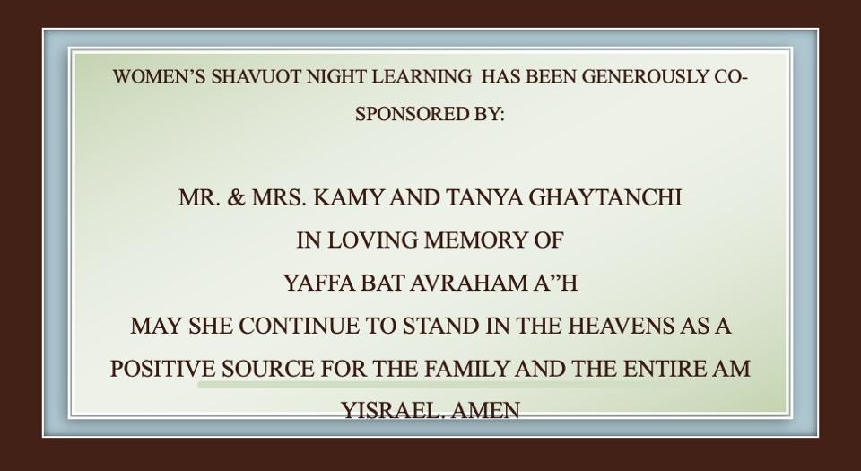 This year you will have the pleasure to hear words of inspiration from Mrs. Ferry Sedaghatpour. The ladies class will be held in the main shul at 11:30pm (Thursday night).