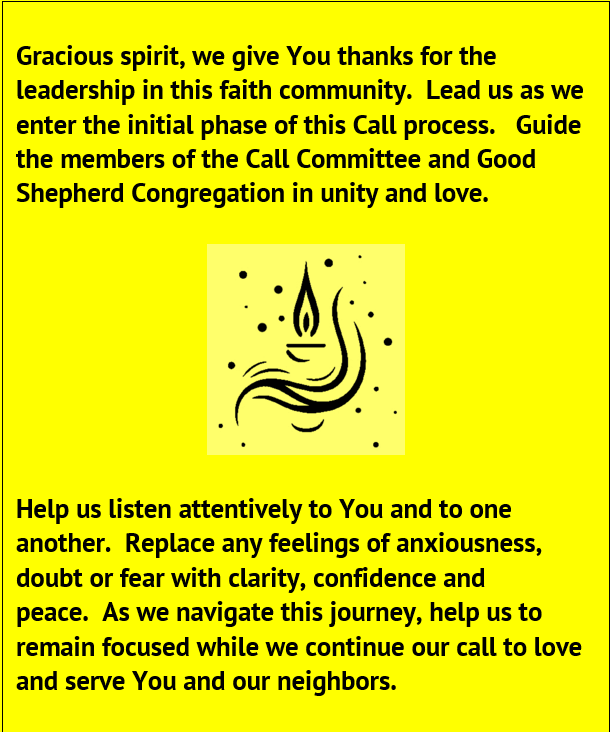 The Call Committee continues its work on the search for a new pastor. A special Sheep Buzz was sent last Friday with an update from the Call Committee. You can read that update here.