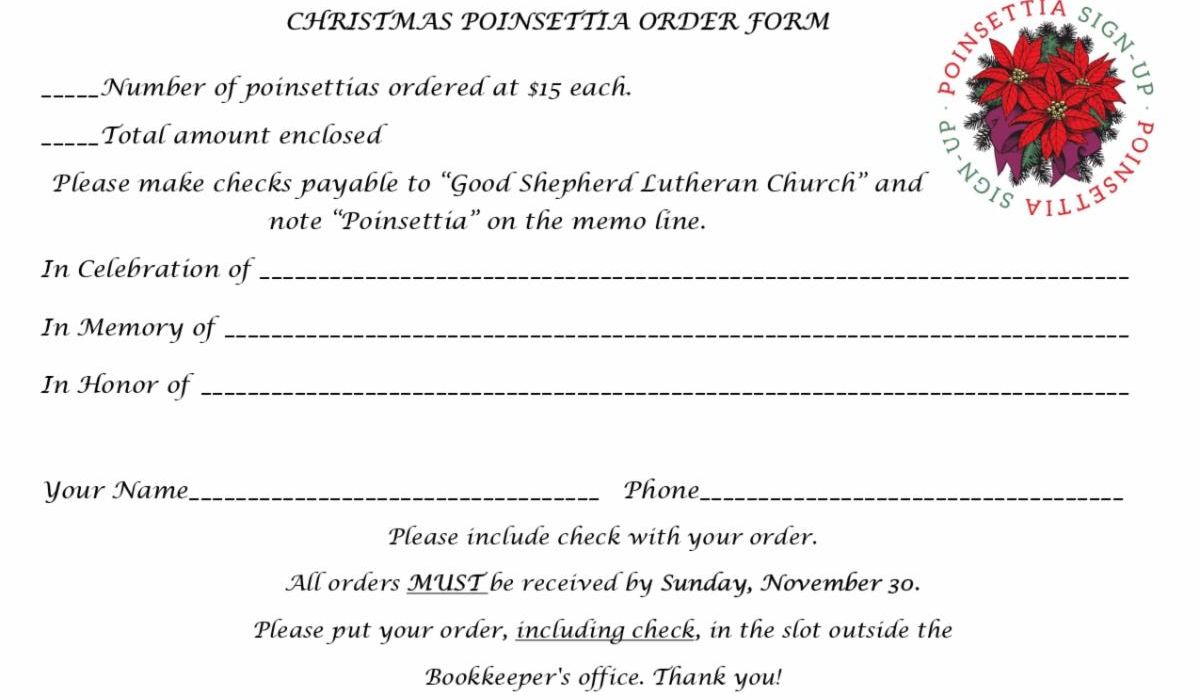 Place your orders for this year's Christmas poinsettia plants. Plants cost $15 each, and orders are due by November 30th. All submissions must include payment and a form. Checks can be made out to GSLC. Place the form/payment in the offering plate or in the gold wall slot. You can download a form here. Extra forms will be on the welcome desk this Sunday.