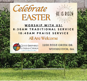 We have purchased 20 yard signs to advertise our worship services in your front yard. Each sign will cost $10. A table is in Fellowship Hall with the signs ready for pick up. (If you stop in during our "Care Day" events, they will be in the Meeting Room"). Money is due at time of pick up. Please make any checks out to GSLC and put "YARD SIGN" in the memo line. These are not dated so they can be used year after year. A great investment in evangelism for Good Shepherd.