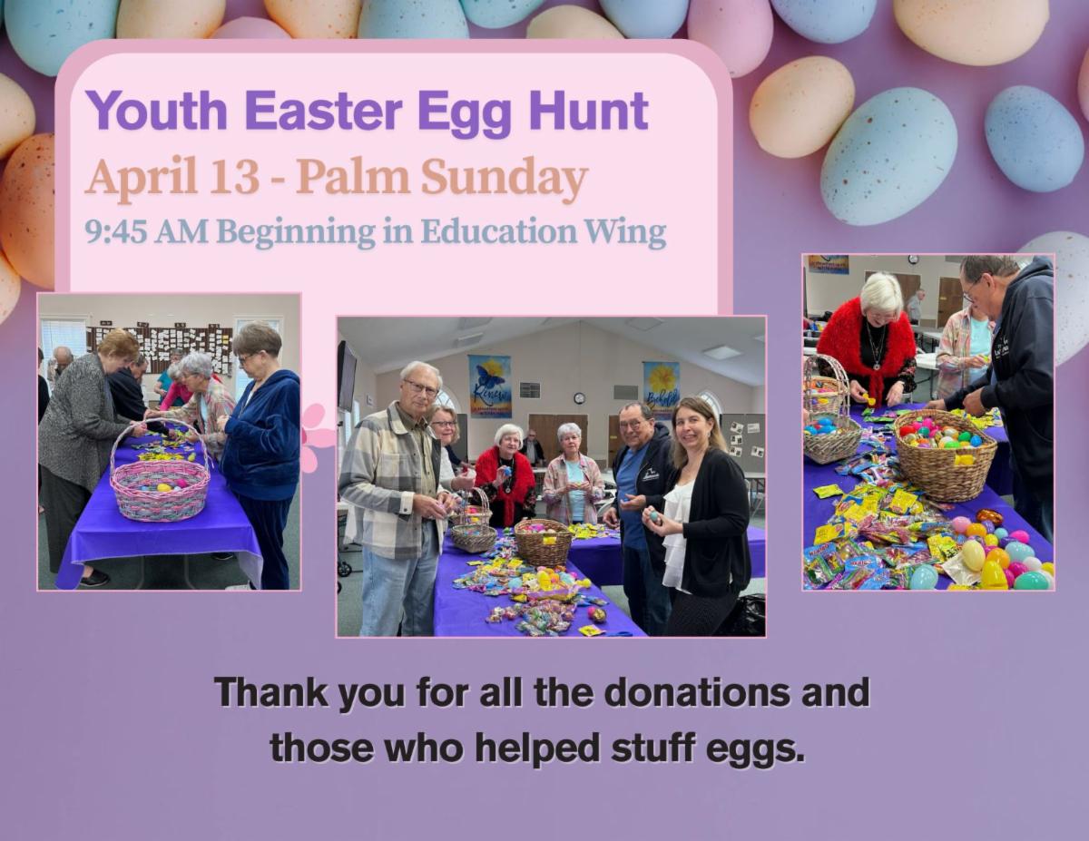 All youth classes We will meet in the Education Wing for our Easter Egg Hunt! Lots of eggs to hunt!