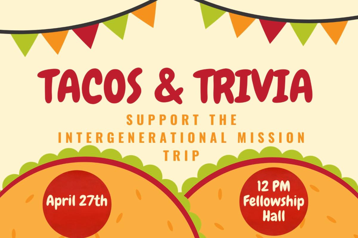 Please join the Youth & Family Ministry Committee on Sunday, April 27 from 12pm-2pm for some delicious tacos and fun trivia to raise money for our Inter-Generational Service Trip in June.