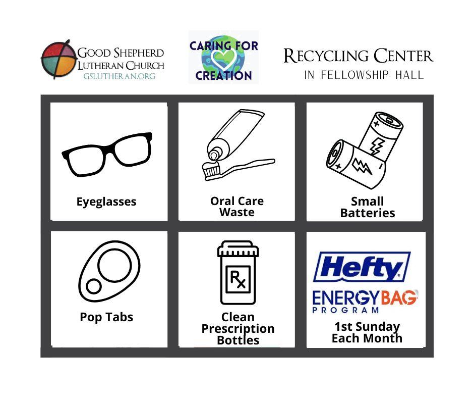 We will also collect Hefty Energy recycle bags this Sunday for all those hard-to-recycle items. Please have them bagged and placed in the container outside the entrance.