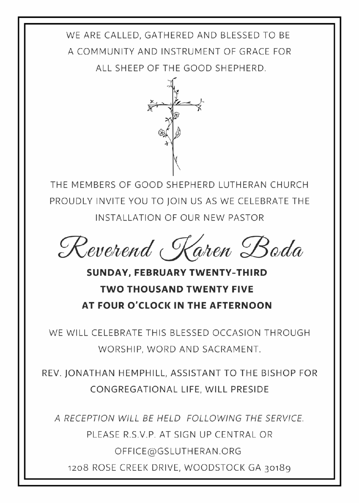 If you receive the Cherokee Tribune, an article about Good Shepherd and the installation of Pastor Karen was in the Thursday edition of the paper this past week. Clip it out and share with a friend. Remember to RSVP for the luncheon this Sunday in Fellowship Hall. | |