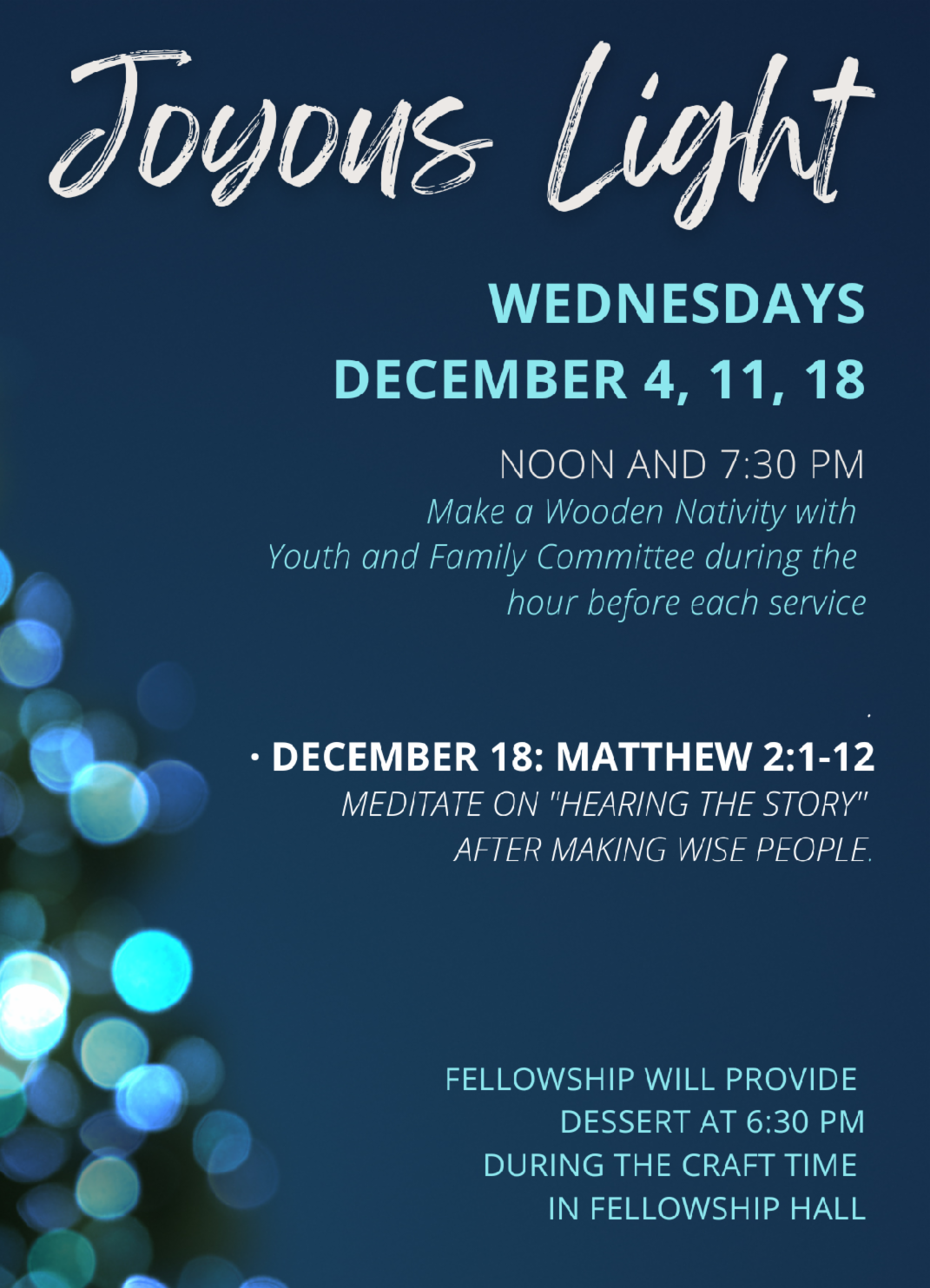 WORD ON WEDNESDAY will meet December 18 at our regular time (10:00 a.m.) in the Meeting Room. This allows for anyone that wants to participate in the 11:00 a.m. Advent Activity in the Fellowship Hall can do so and/or attend worship at noon. Advent activities (6:30 PM) and worship service (7:30 PM) opportunities will also be available in the evening.