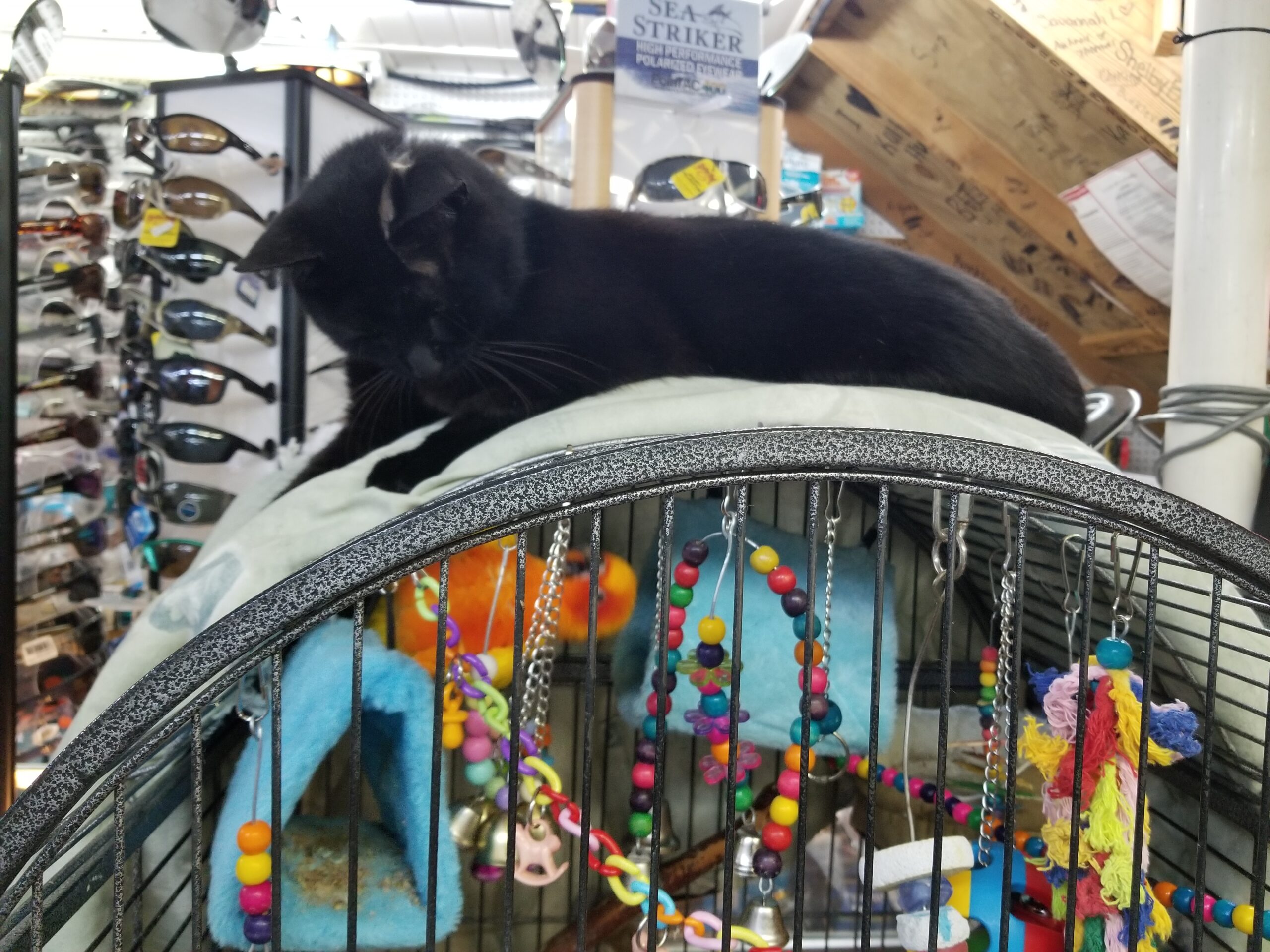 A little too curious for comfort! Skid-Road, our black kitty, wanted to play with Pirate Pete, our Sun Conure.
