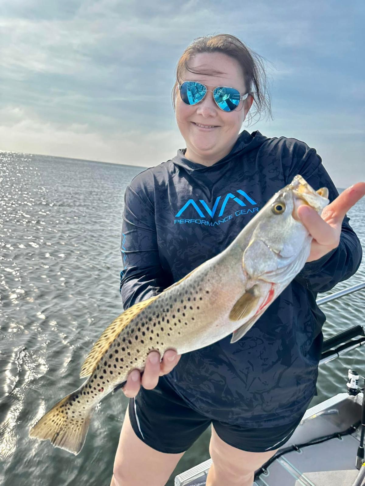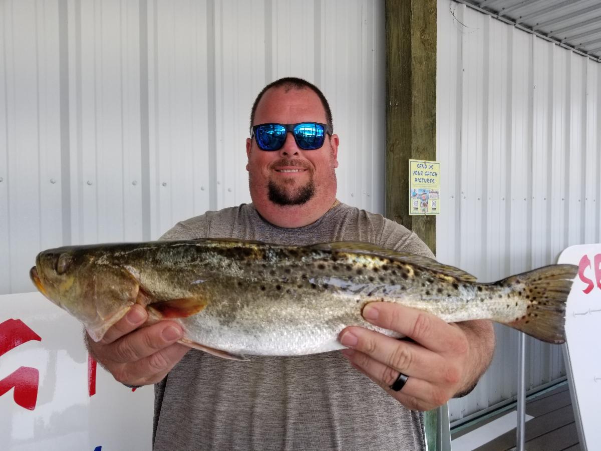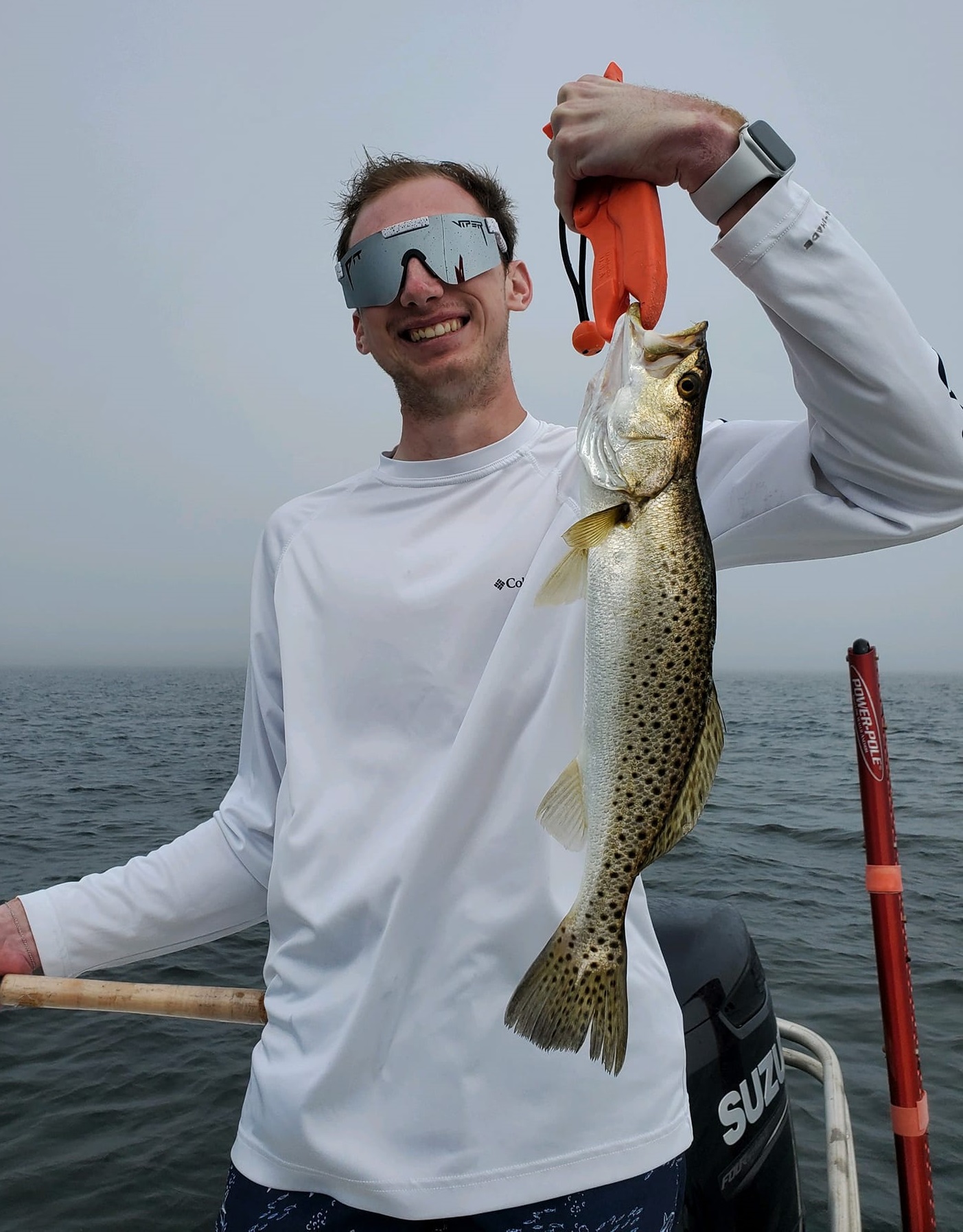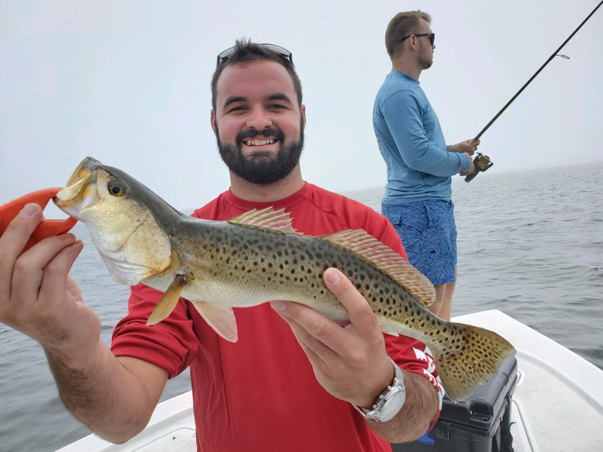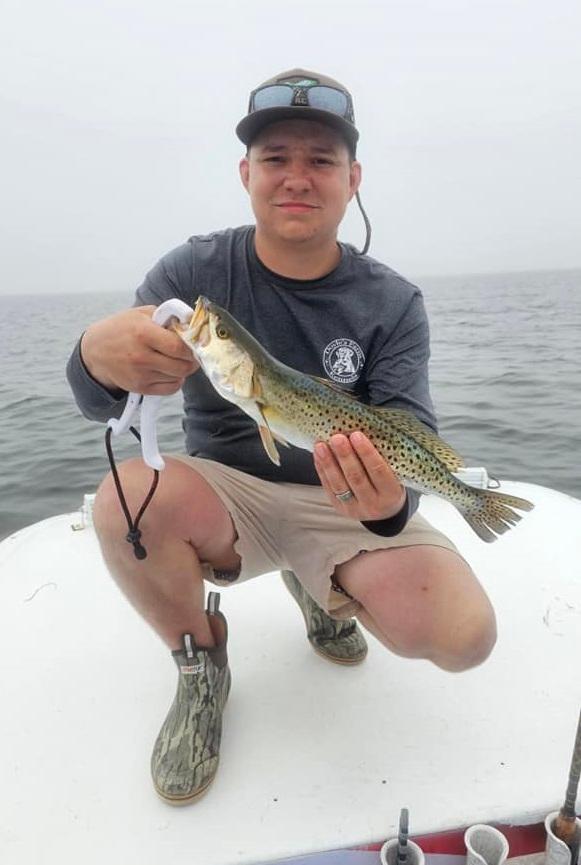 Caleb Toney is holding up a trout he caught with Marker One Charters.