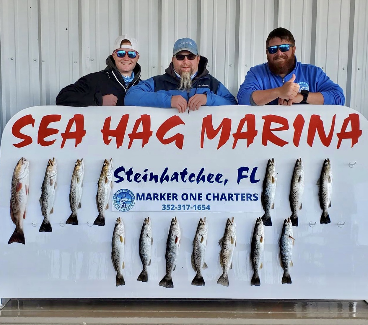 | Jim, Keith & Harrold, from Georgia, went fishing with Capt. Chris Chico Graham and came back with a board of trout. | Jim landed a perfect trout with Capt. Chris Chico Graham. | Capt. Scott Peters, Shain Cormack, Owen Dodd & Bubba Sellers packed the board with sheepshead, redfish, flounder & trout! What a day! | Capt. Chris Wagoner, with Marker One Charters, helped Mia Hughes land a trout. | |