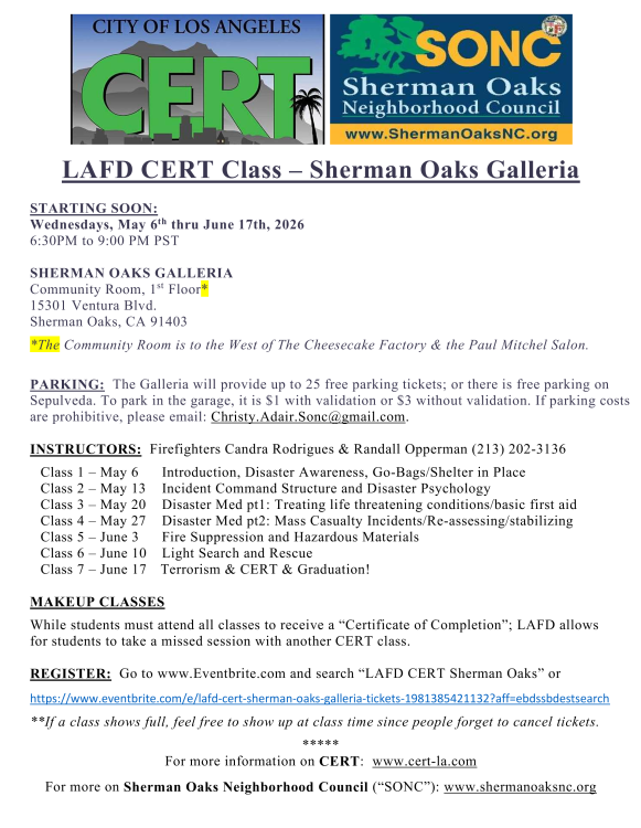 See flyer for further details. You can also find additional information how to participate in programs such as C.E.R.T., by going to: www.cert-la.com or email: christy.adair.sonc@gmail.com