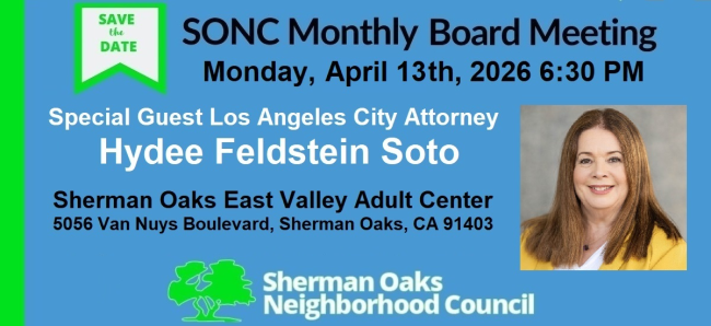 I invite you to join us at our next SONC Board & Community Meeting on Monday, April 13th at 6:30 p.m. at the Sherman Oaks Adult Center. We will welcome our guest speaker, Los Angeles City Attorney Hydee Feldstein-Soto.