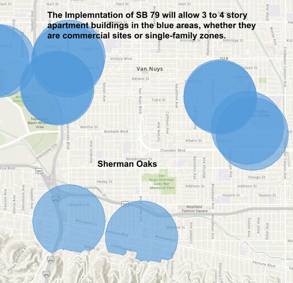 The city is implementing SB 79 with a local alternative plan that basically allows 3-4 story apartments in single family neighborhoods (4 story if they add 3 or more-bedroom unit apartments) in these SB 79 qualifying areas. The city will allow more than 3 stories in height on the boulevards. This map shows the impacted areas in blue for our community.