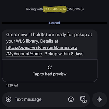 The Westchester Library System has switched to a new text notification service. If you have opted in for texts to your phone, the new messages no longer come from "wls-ils@wlsmail.org" but a new SMS number (914) 384-3604. The number is not SPAM or phishing.
