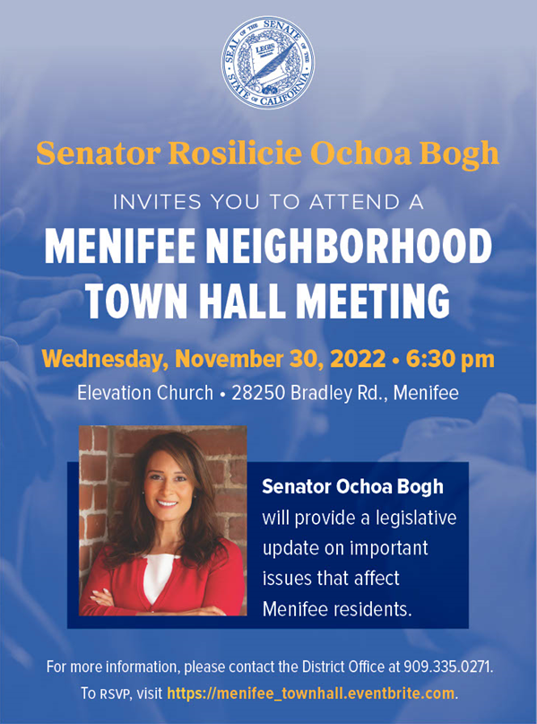 Wed, Nov. 30 at 6:30 PM - Menifee Neighborhood Townhall Meeting with Senator Rosilicie Ochoa Bogh