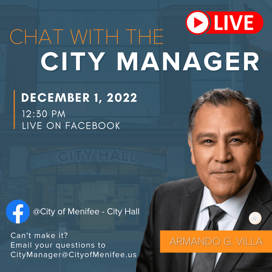 City Manager Armando G. Villa will be live on Facebook on Thursday, December 1, starting at 12:30 PM. Hear the latest city updates and ask questions for the city's management team.