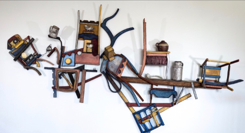 Domestic table settings, disassembled furniture and recycled wood are the building blocks of these narrative assemblages.