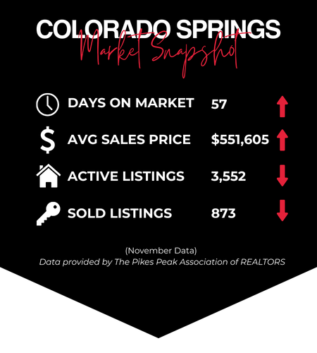 As we head into December, the Colorado Springs market is showing a typical year-end rhythm. Homes are spending a bit longer on the market at about 57 days while the average sales price has inched up to $551,605. Inventory continues to tighten with fewer new listings and lower sales activity as the holiday season arrives.