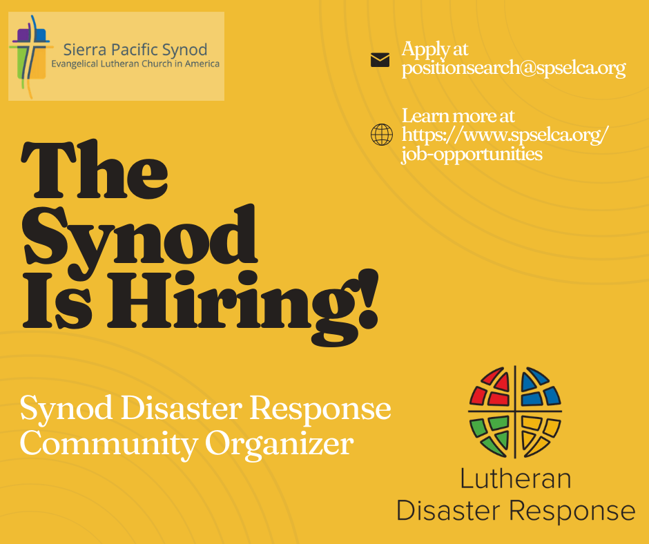 Sierra Pacific Synod is hiring a Synod Disaster Response Community Organizer. This position will focus on building a synod-wide team over a three-year period to prepare for and respond to both climate-related disasters. This hybrid position can be split into two part-time roles, or one full-time position, depending on the candidates.