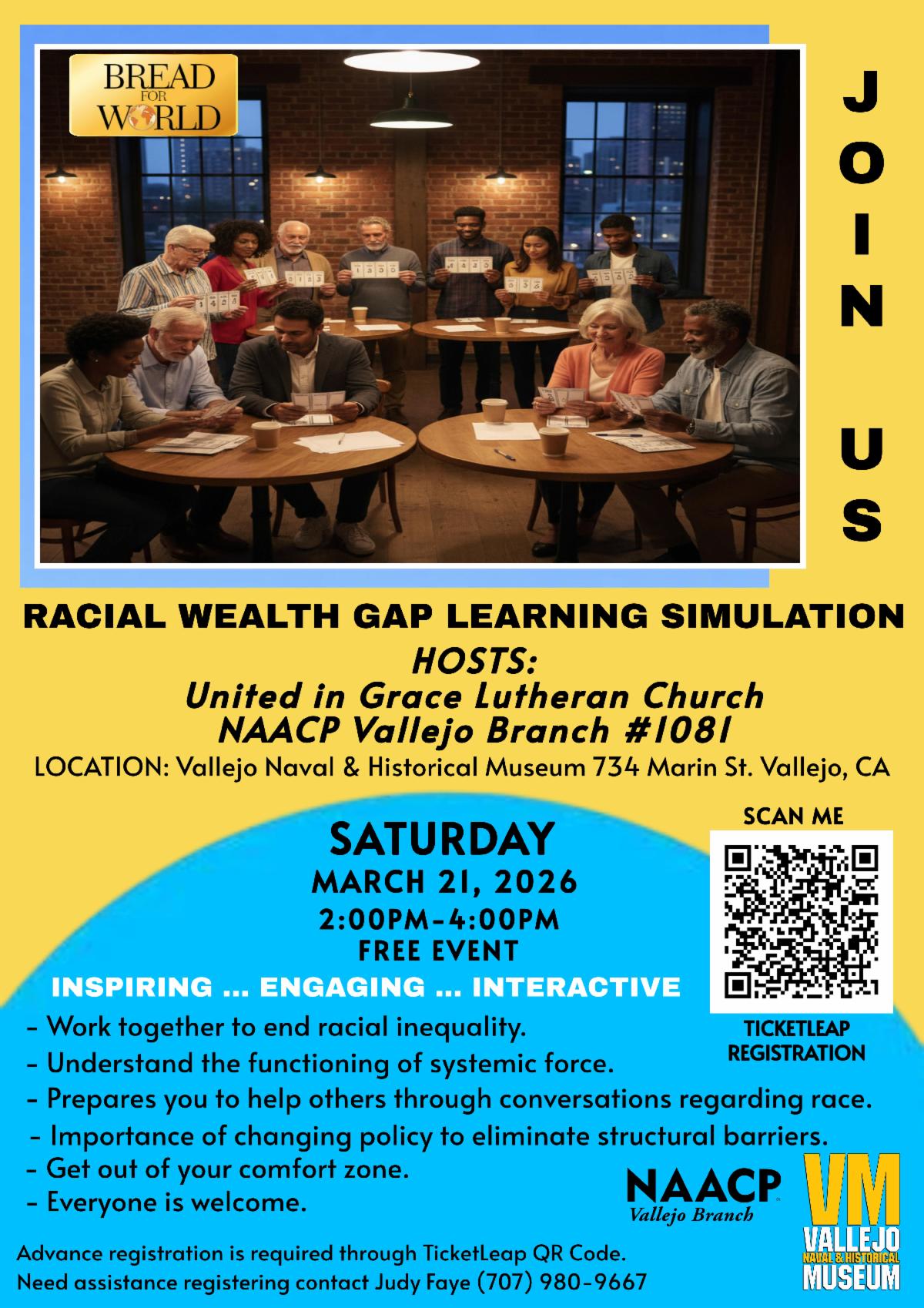 | | Resources In & Outside The Synod | | Racial Weath Gap Learning Simulation in Vallejo - March 21 | United in Grace Lutheran Church of Vallejo and the NAACP Vallejo Branch No. 1081 are hosting a Racial Wealth Gap Learning Simulation on Saturday, March 21st, from 2 pm to 4 pm at the Vallejo Naval and Historical Museum in downtown Vallejo. Register HERE! |