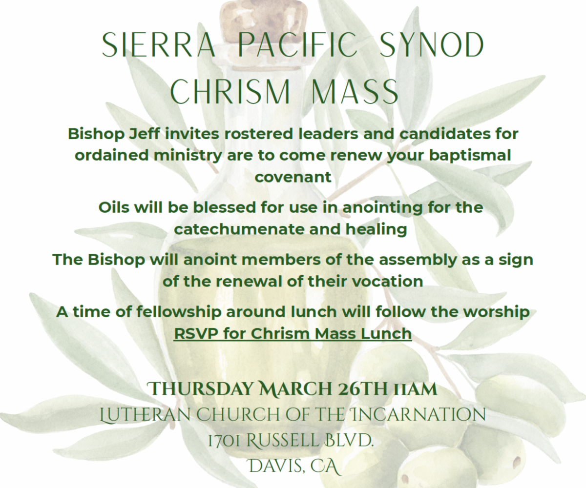 Bishop Jeff invites rostered leaders and candidates for ordained ministry to come renew their baptismal covenant on Thursday, March 26th, at 11 am, at the Lutheran Church of the Incarnation, Davis. Oils will be blessed for use in anointing catechumens and in healing. The Bishop will anoint members of the assembly as a sign of the renewal of their vocation.