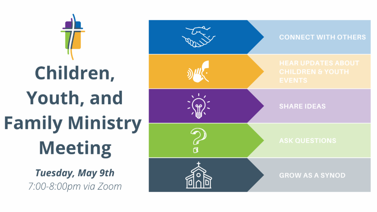 Save-the-date for our upcoming spring Children, Youth and Family Ministry meeting! This meeting will provide an opportunity for folks to connect with others who work with young people in their church, share ideas about children and youth ministry throughout the synod, ask questions about the upcoming ELCA Youth Gathering, WSYG, SPSYC Retreats and so much more.