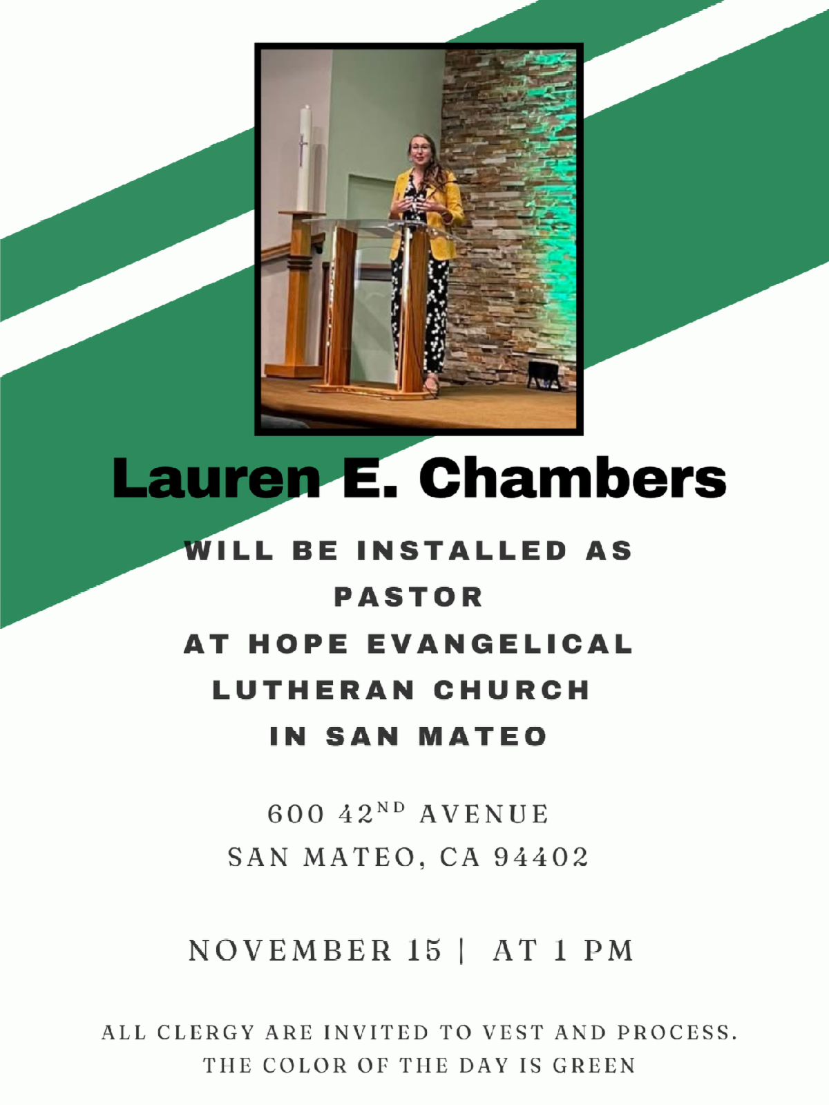 All are warmly invited to celebrate the installation of The (soon to be) Rev. Lauren E. Chambers as Pastor of Hope Evangelical Lutheran Church in San Mateo. Clergy are invited to vest and process; the color of the day is green. Reception to follow.
