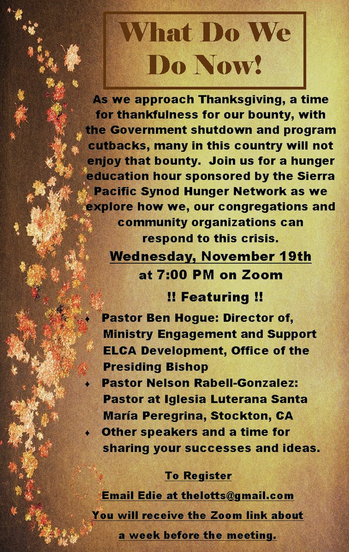 | | Synod Hunger Network Zoom Meeting - Nov 19 | | Join the Sierra Pacific Synod Hunger Network on Wednesday, November 19, at 7 pm on Zoom as we explore how to address the hunger crisis. To register, email Edie Lott at thelots@gmail.com. | |