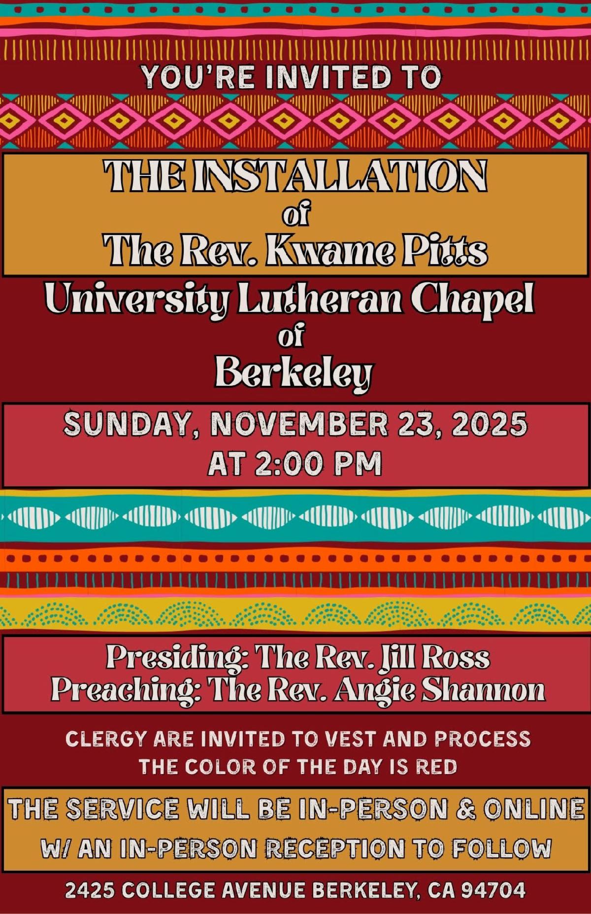 University Lutheran Chapel of Berkeley invites you to the Installation of their new Pastor, The Rev. Kwame Pitts, on Sunday, November 23rd at 2:00 pm. The Rev. Jill Ross will preside, and The Rev. Angie Shannon will preach. Clergy are invited to vest and process. The color of the day is red. The service will be in-person and online. An in-person reception will follow the service.