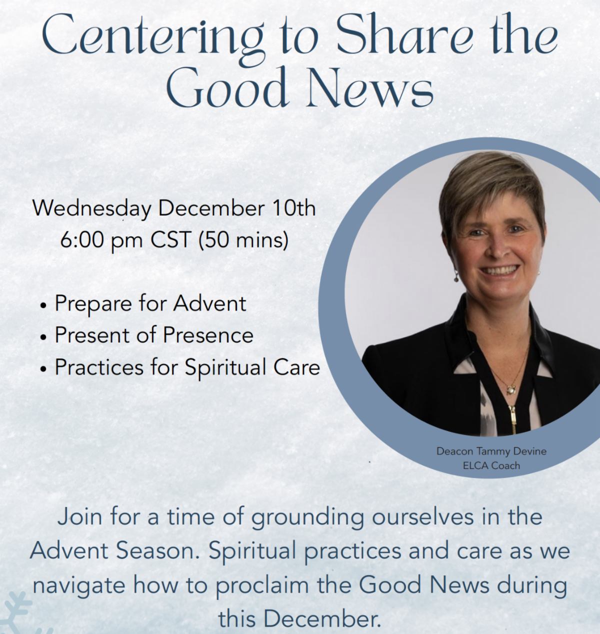 Join the ELCA on Wednesday, December 10, at 4 pm PT (6 pm CT) for a time of grounding and renewal as we enter the Advent Season. Hosted by Deacon Tammy Devine, this session invites us to slow down, care for our spirits, and rediscover how to proclaim the Good News with authenticity and hope throughout December.