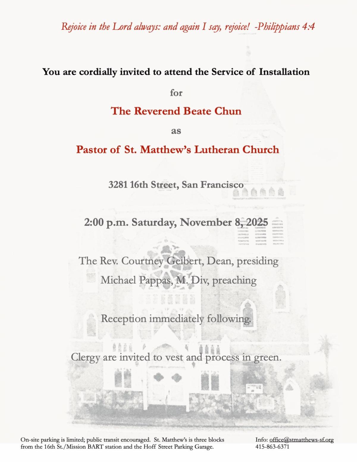 | You are warmly invited to attend the Service of Installation for The Rev. Beate Chun as Pastor of St. Matthew’s Lutheran Church, 3281 16th Street, San Francisco, on Saturday, November 8, 2025, at 2:00 p.m. Rostered leaders are invited to vest with the color of the day being green. | The (Soon to Be) Rev. Lauren E. Chambers' Installation at Hope San Mateo - Nov 15 | |